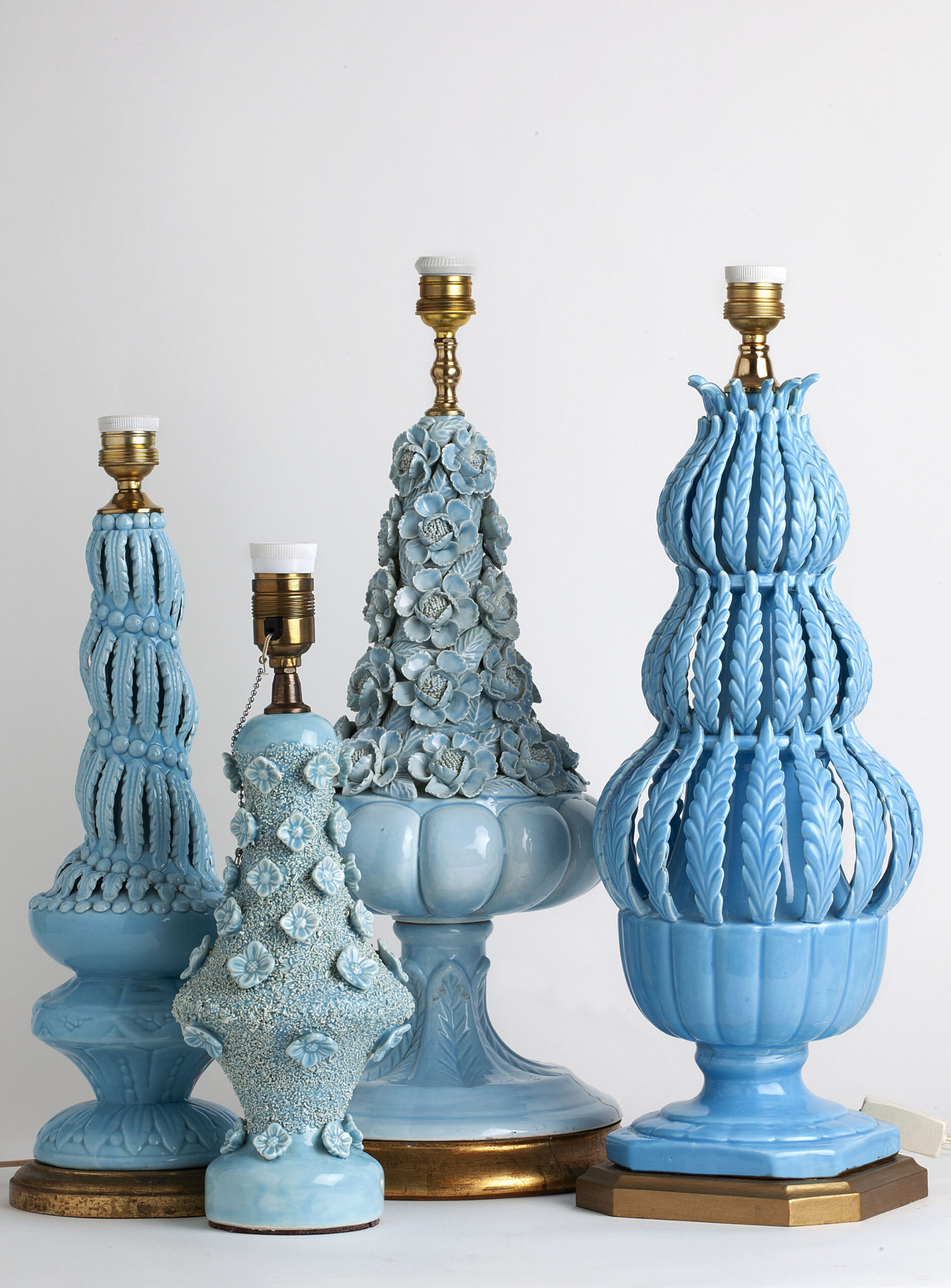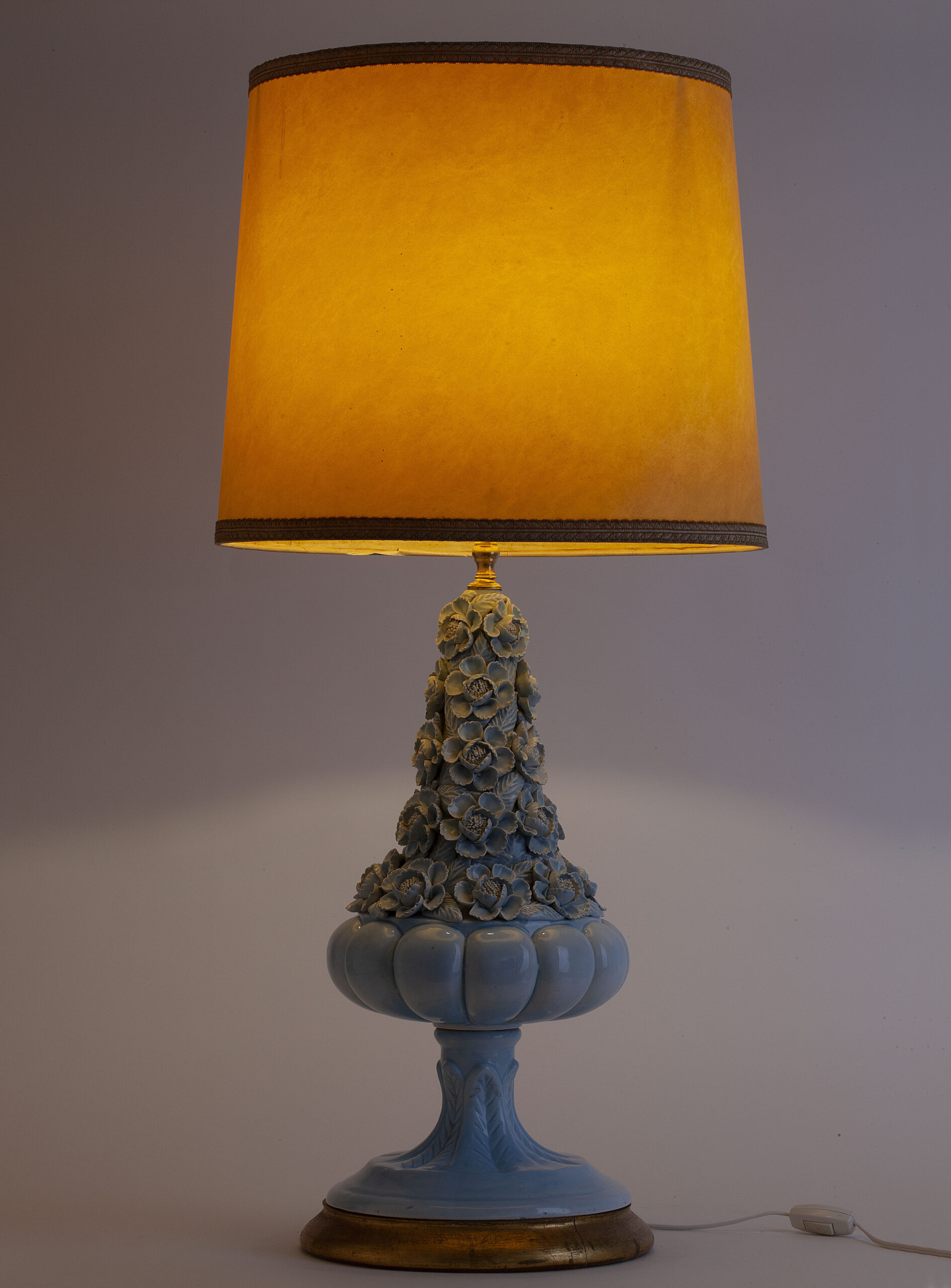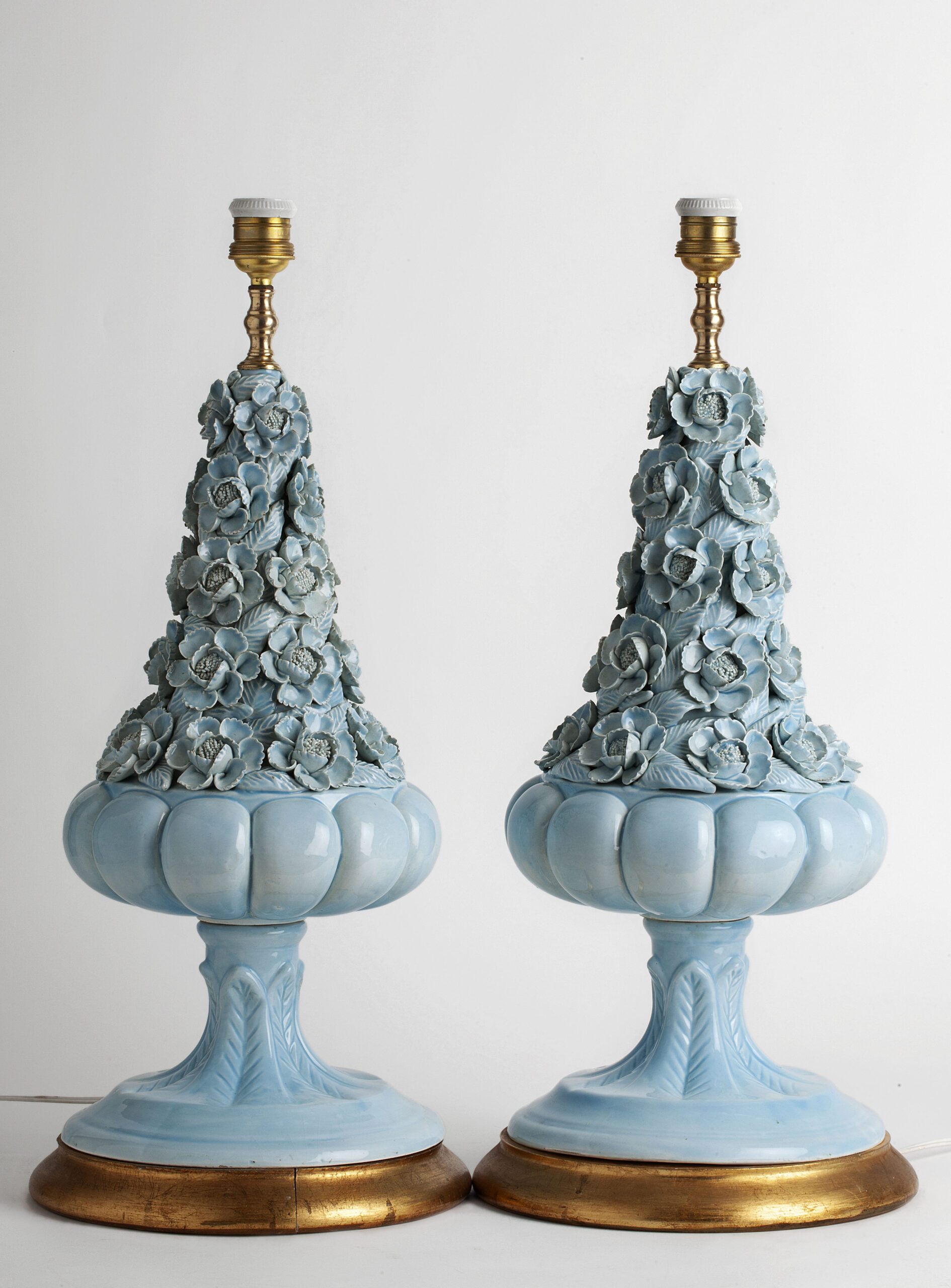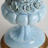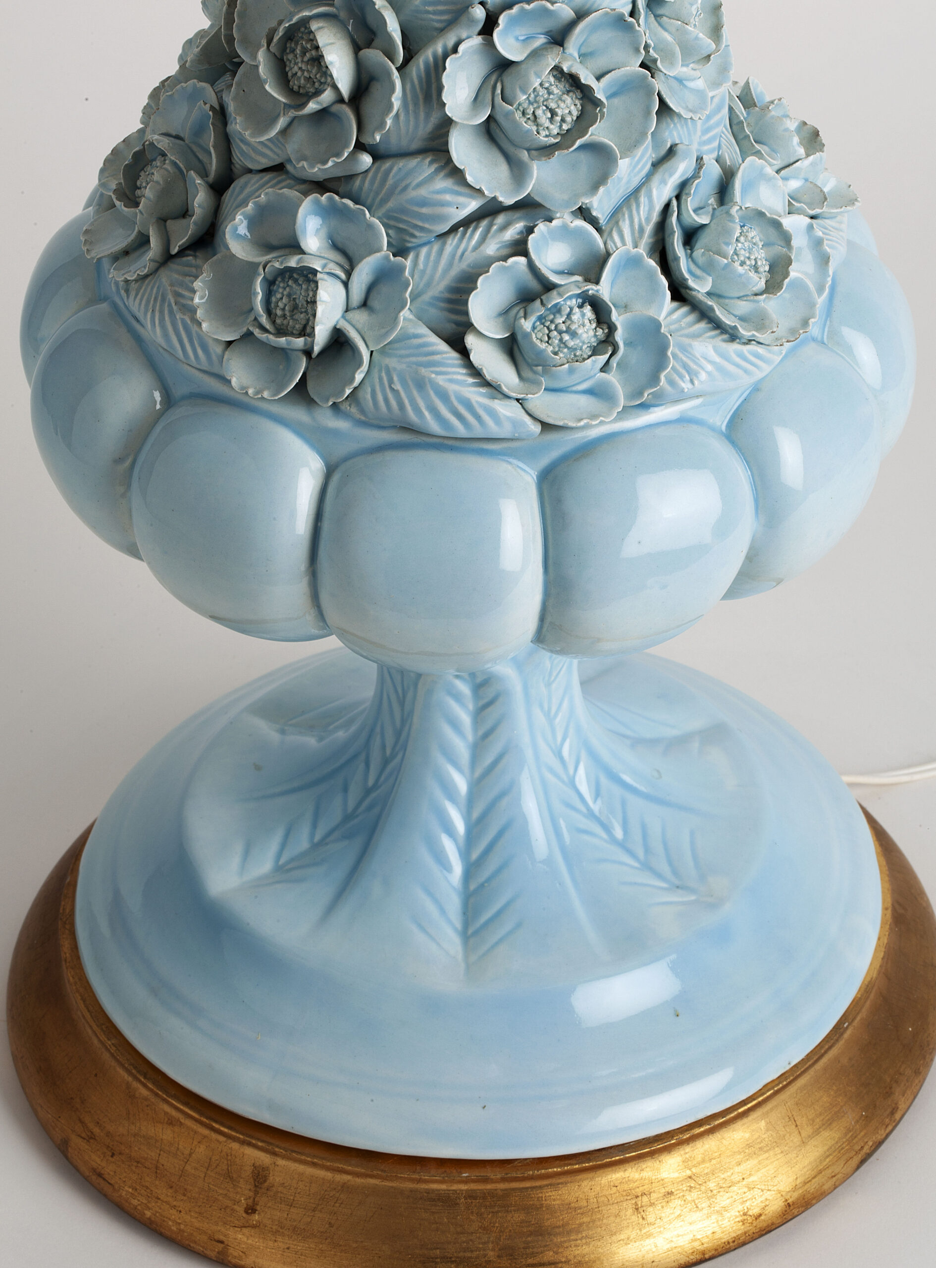 Glazed ceramic lamps with a glossy blue finish and a wooden base in gold leaf. The central bowl is decorated with multitude of flowers, whose petals and leaves have been individually hand-modelled.