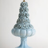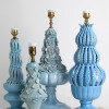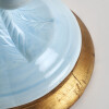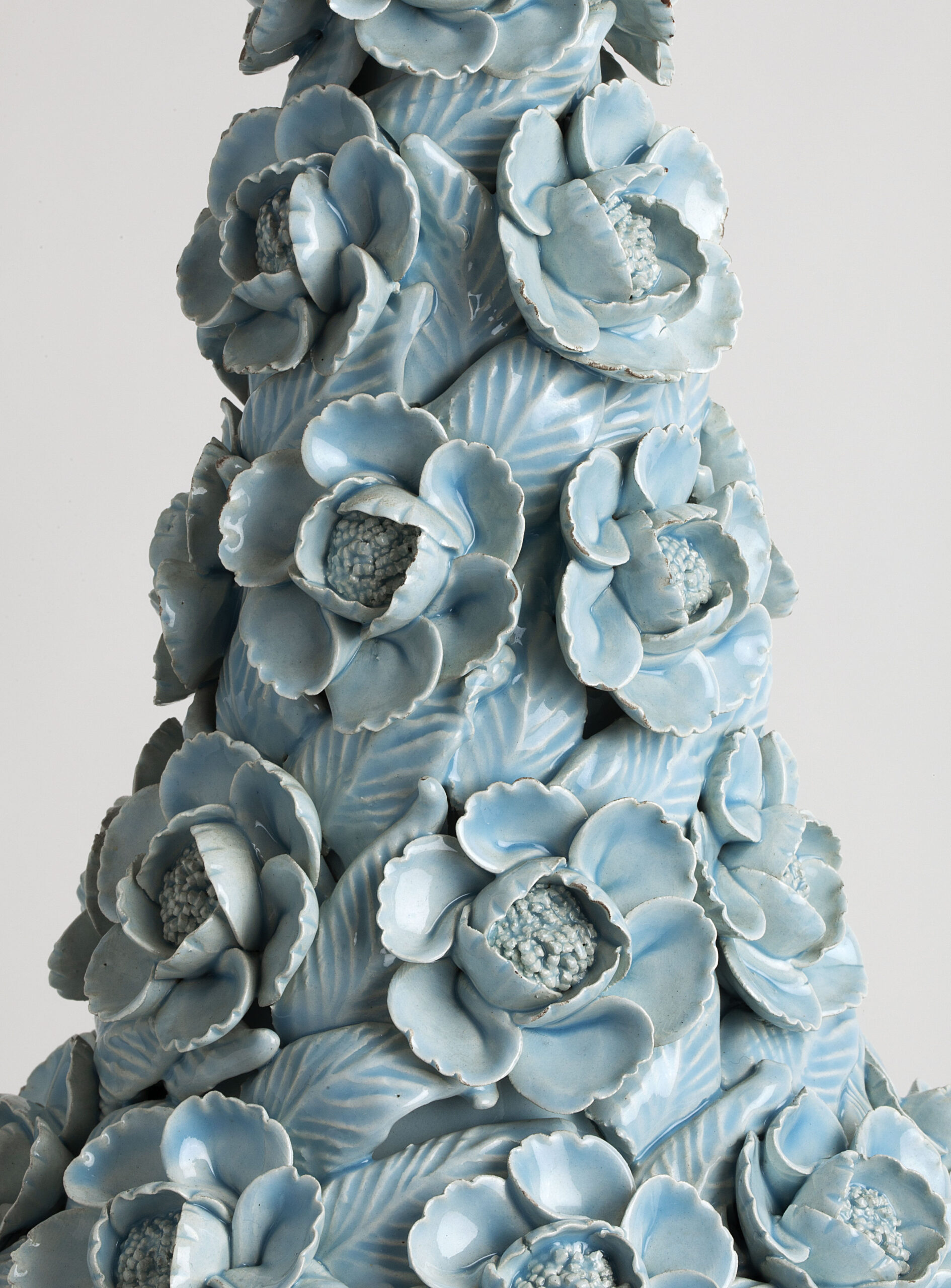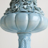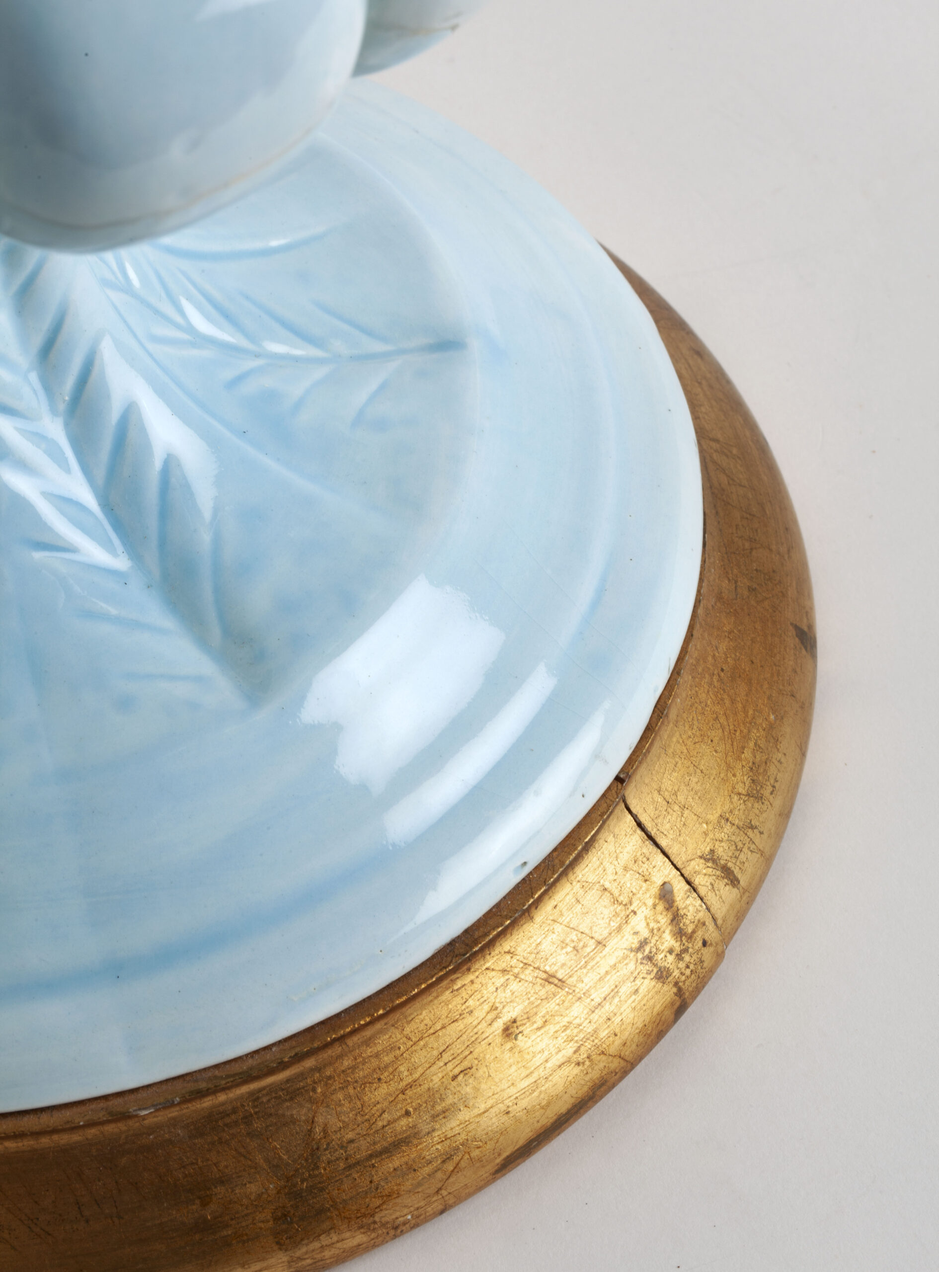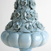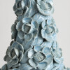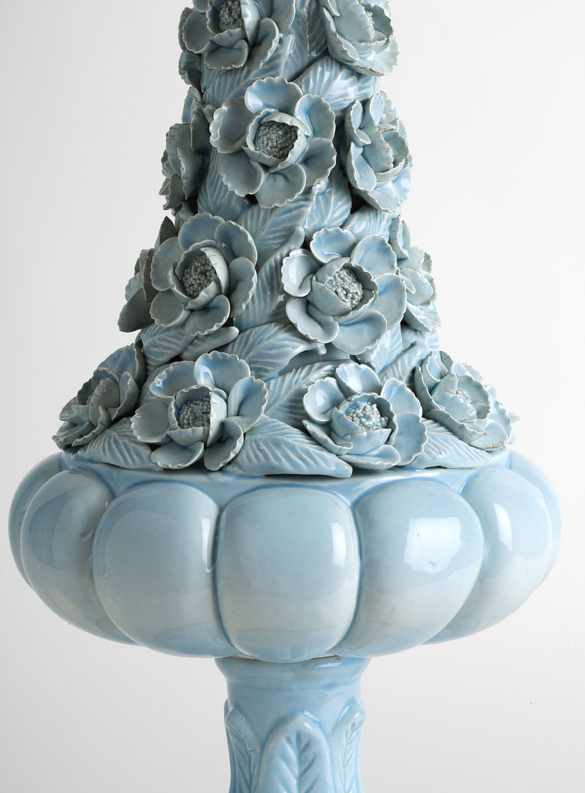 Glazed ceramic lamps with a glossy blue finish and a wooden base in gold leaf. The central bowl is decorated with multitude of flowers, whose petals and leaves have been individually hand-modelled.