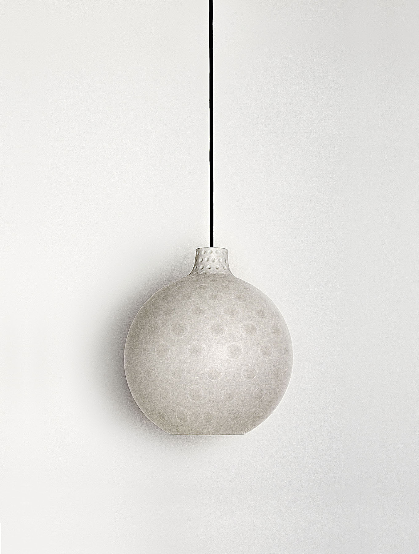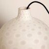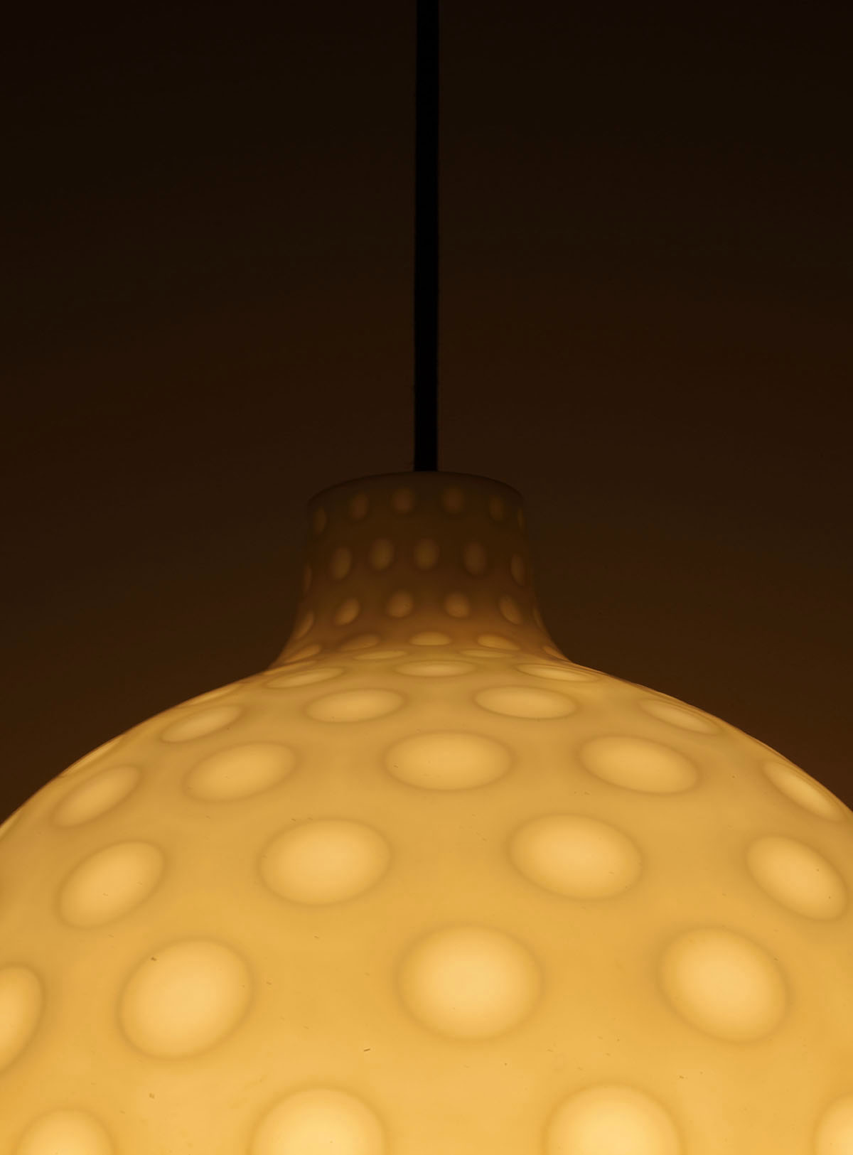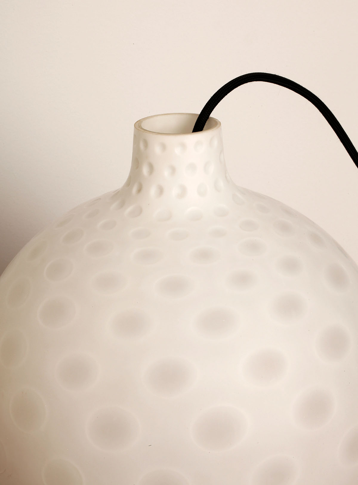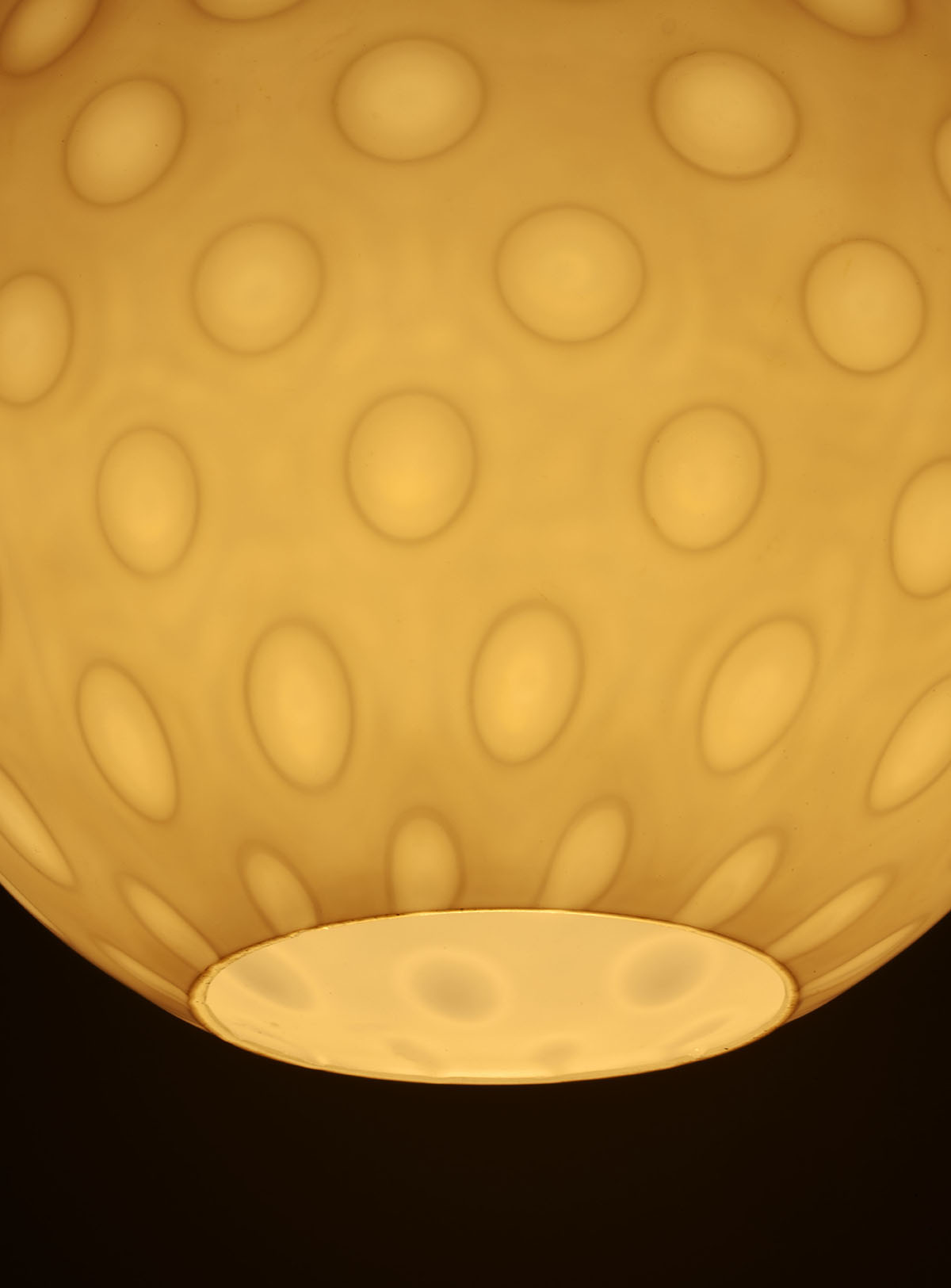 The shade, circular in shape with a lower opening, is made of hand-blown opal glass.