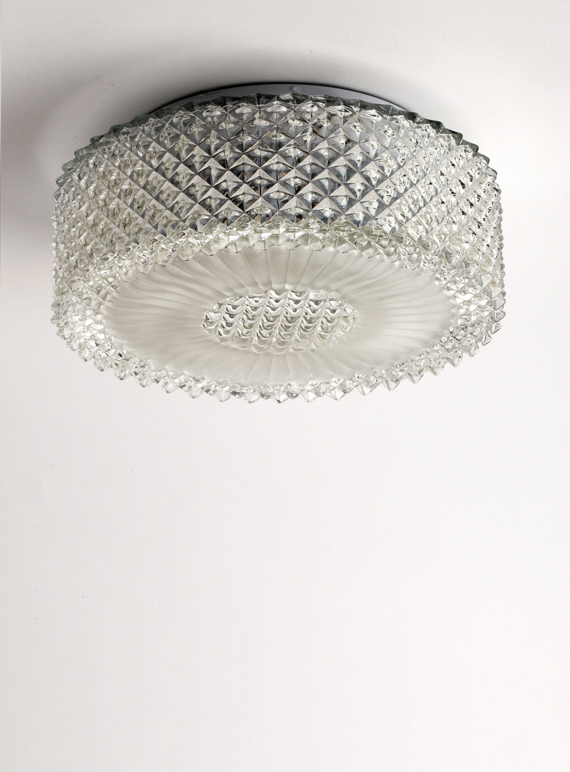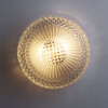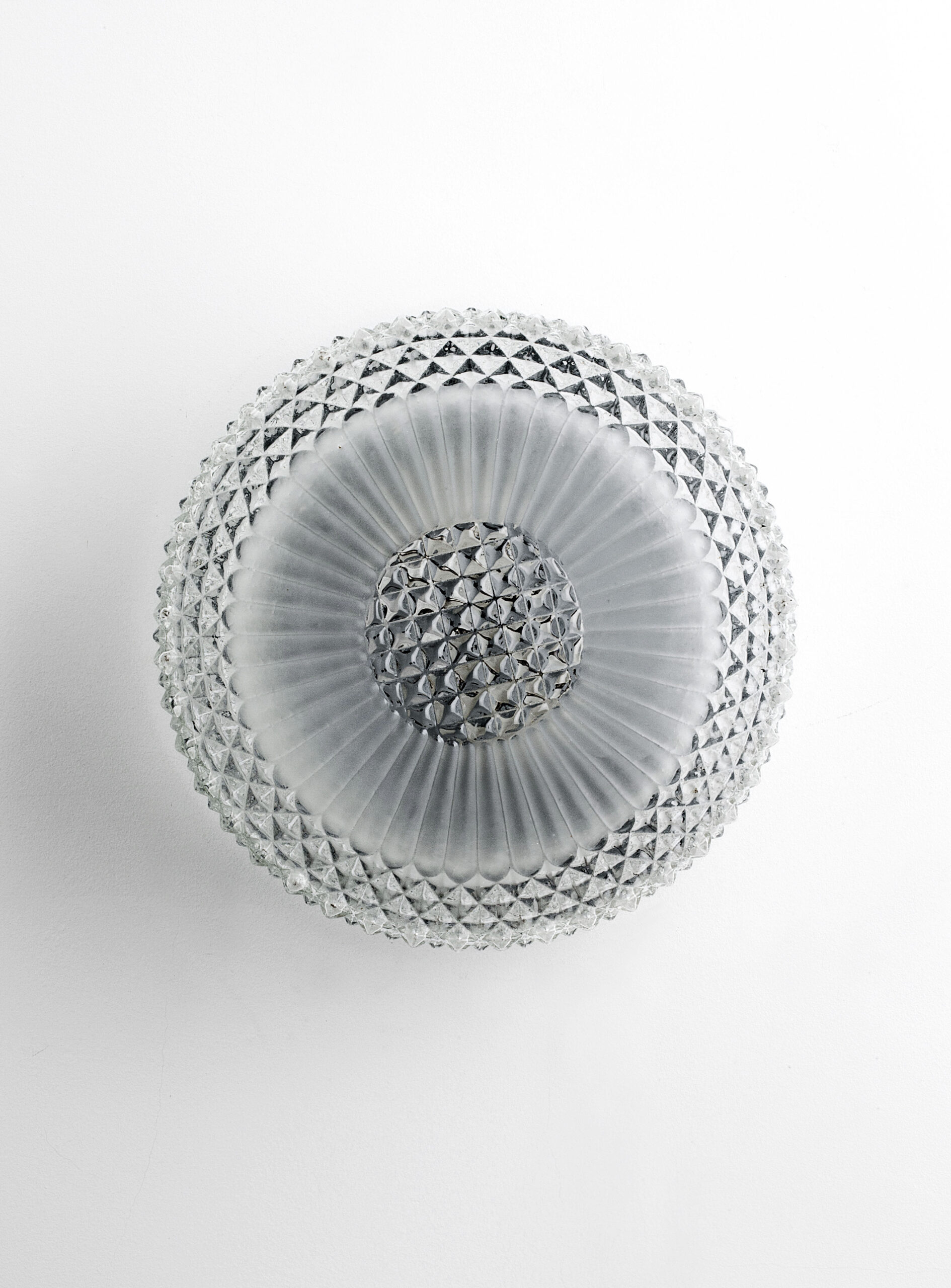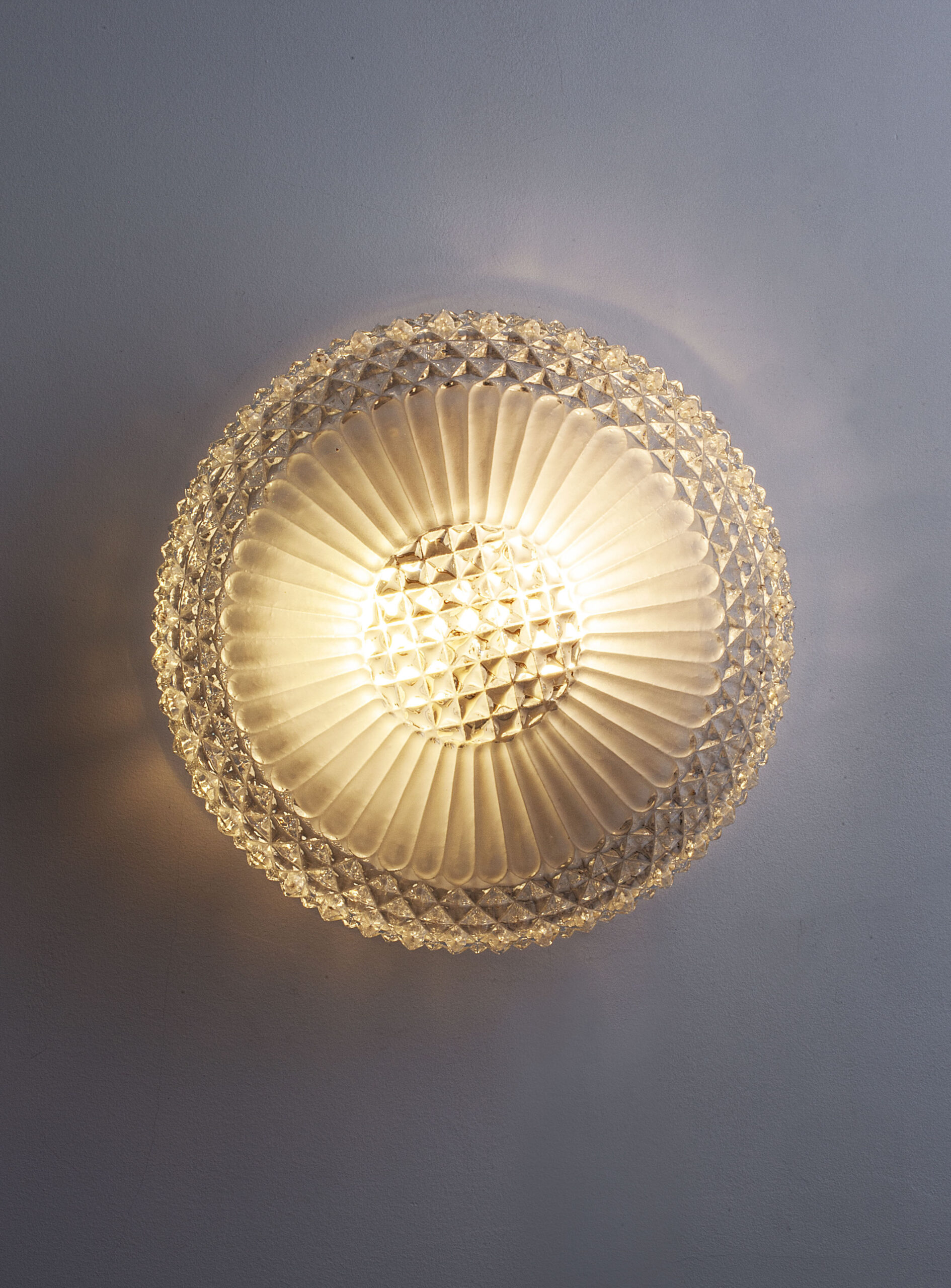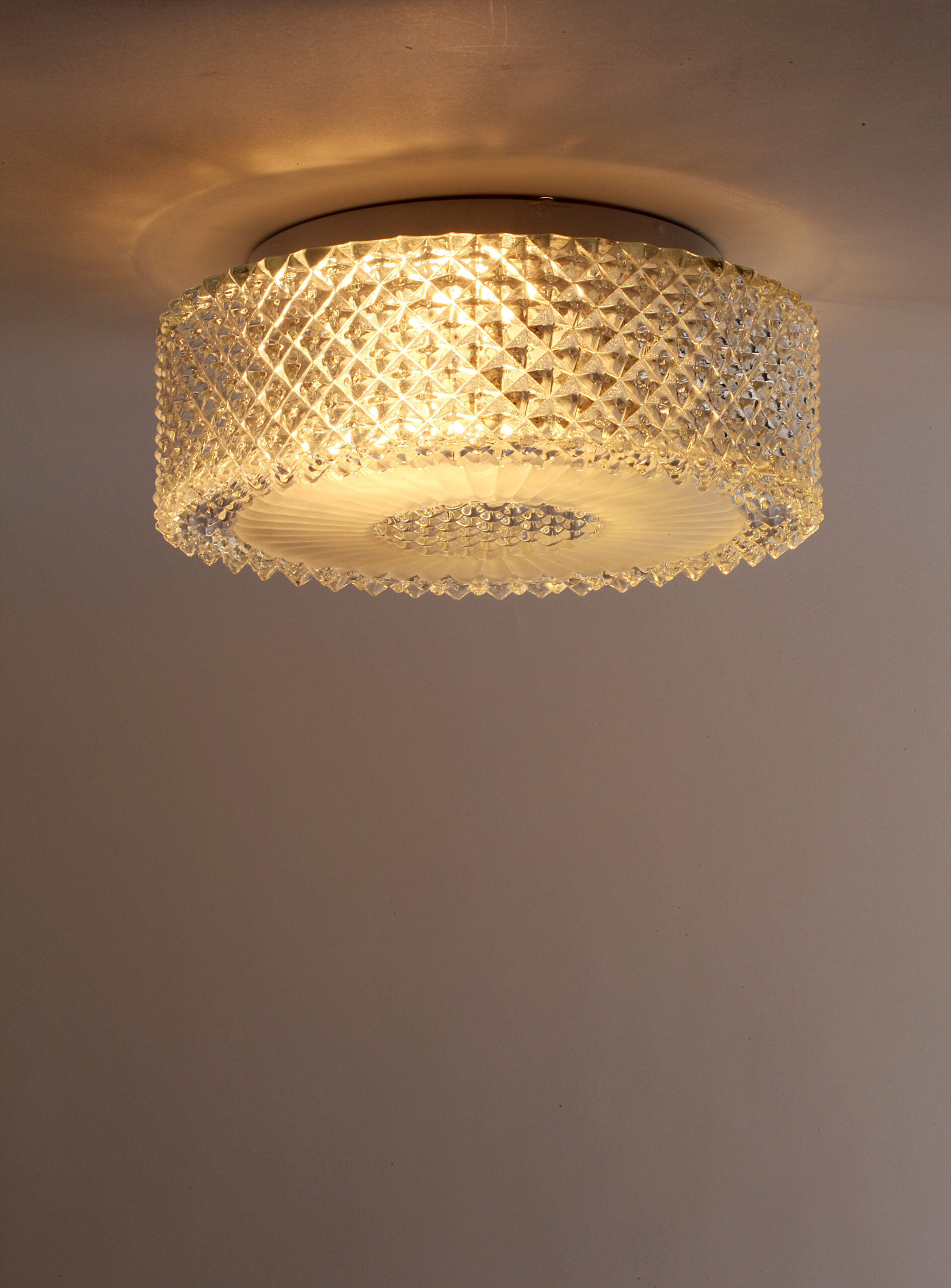Transparent glass ceiling or wall lamp, with a faceted diamond-shaped pattern and a frosted glass motif surrounding the centre, softening the light and creating a pleasant glow.