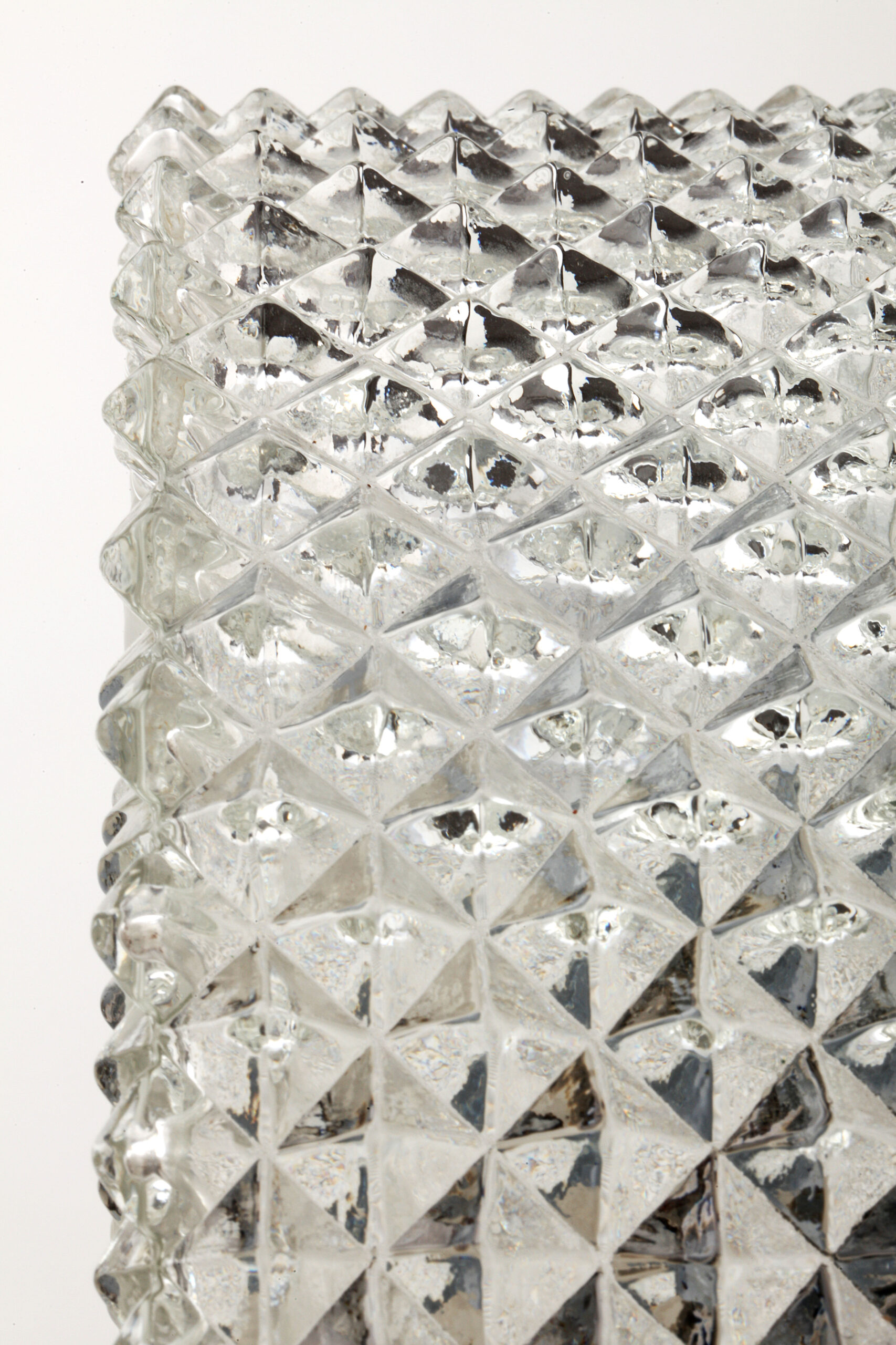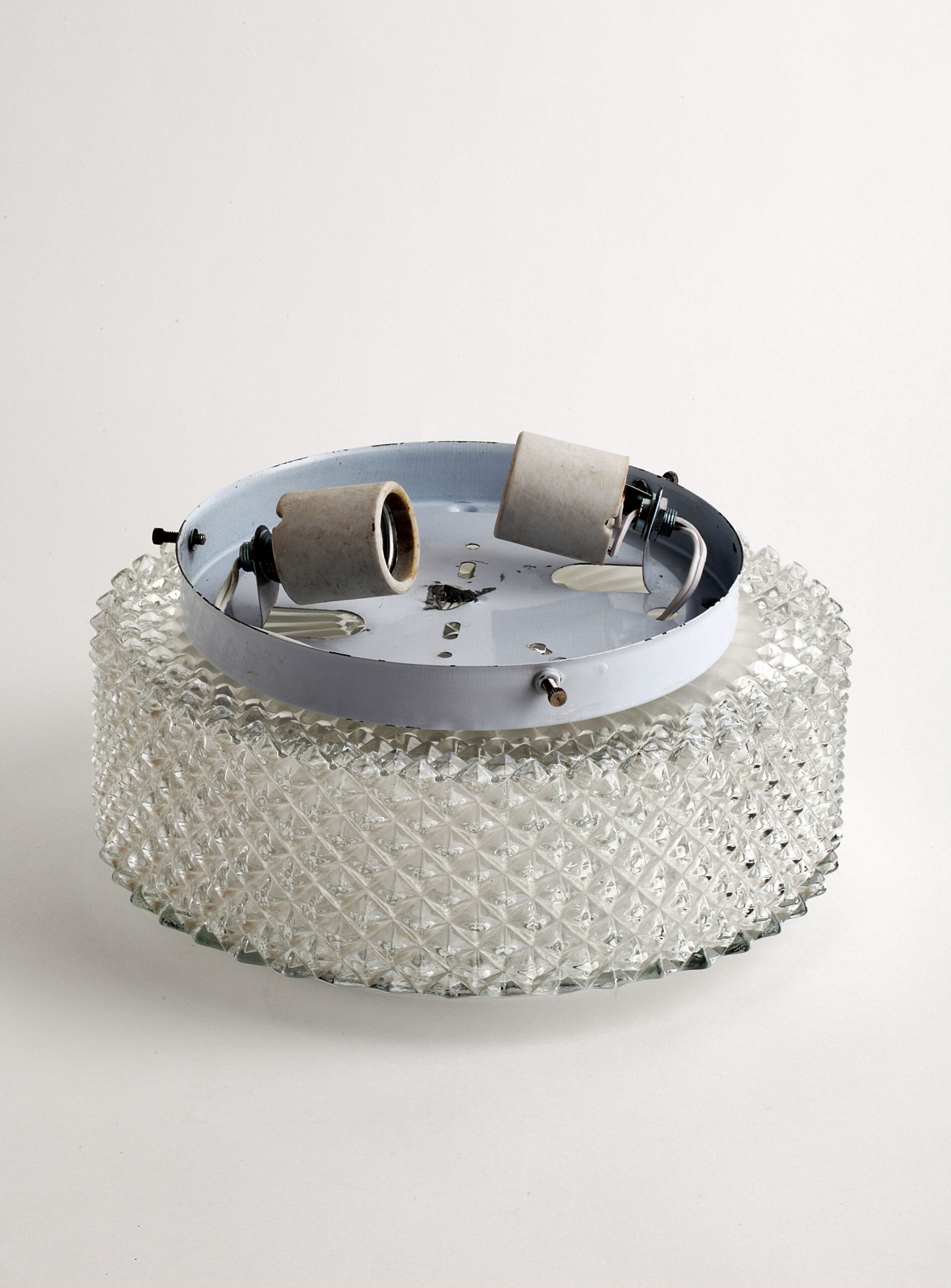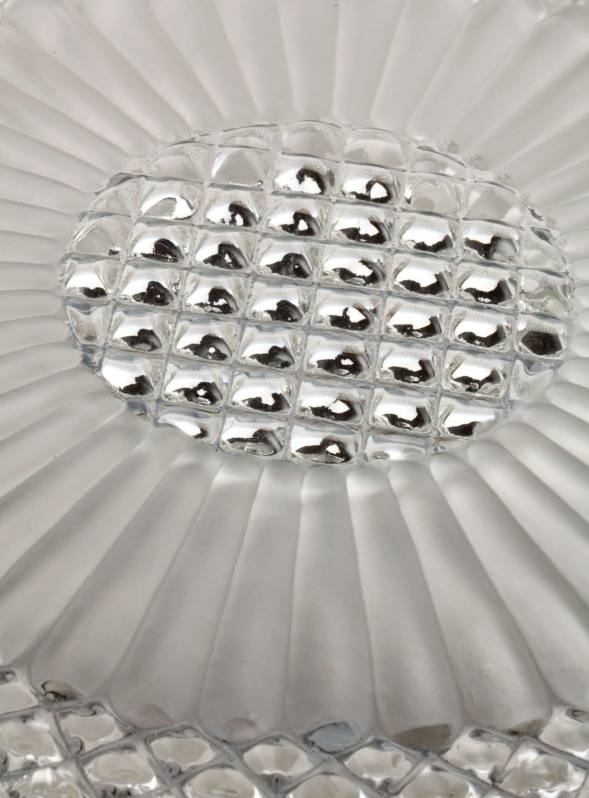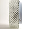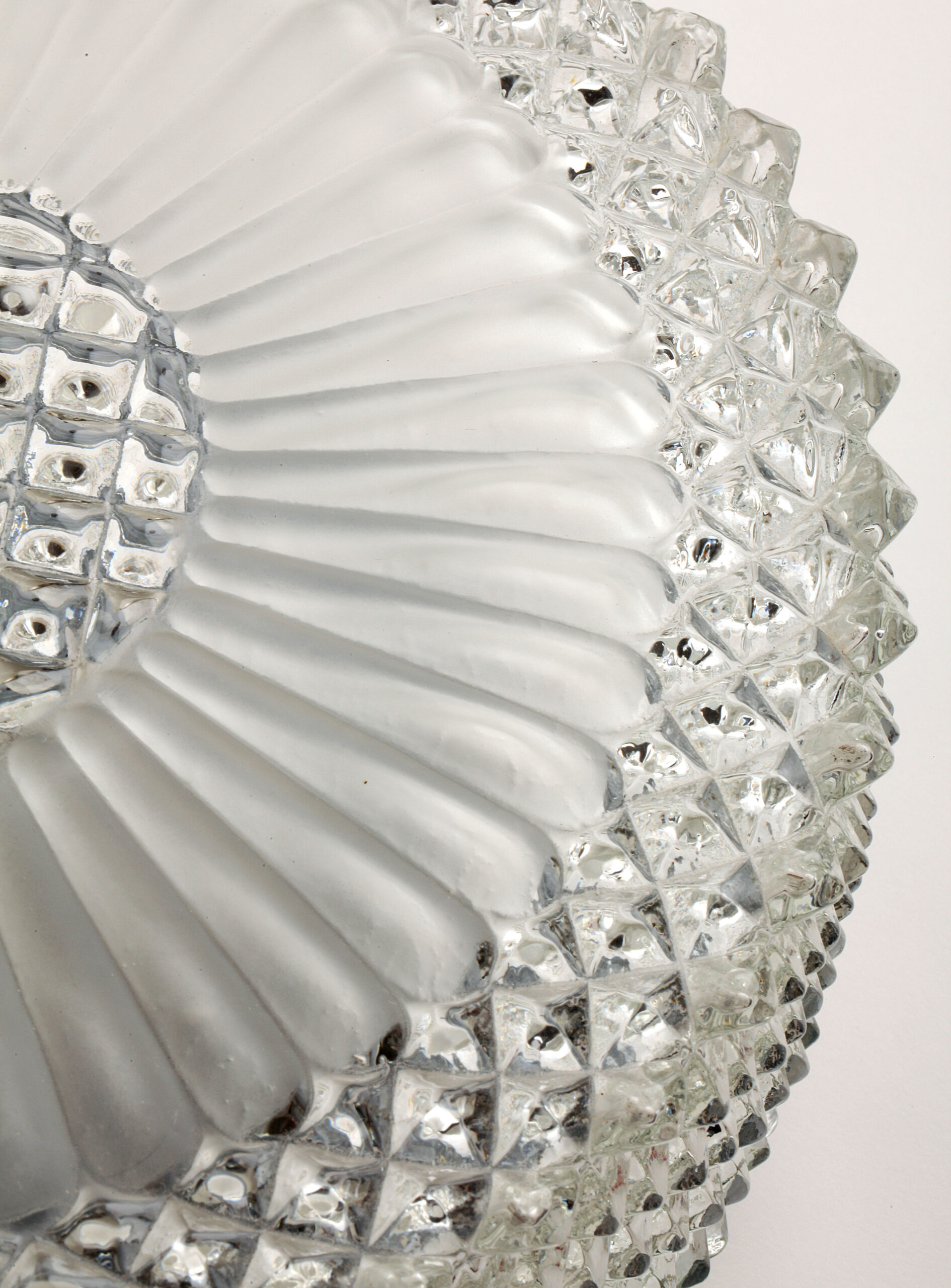 Transparent glass ceiling or wall lamp, with a faceted diamond-shaped pattern and a frosted glass motif surrounding the centre, softening the light and creating a pleasant glow.