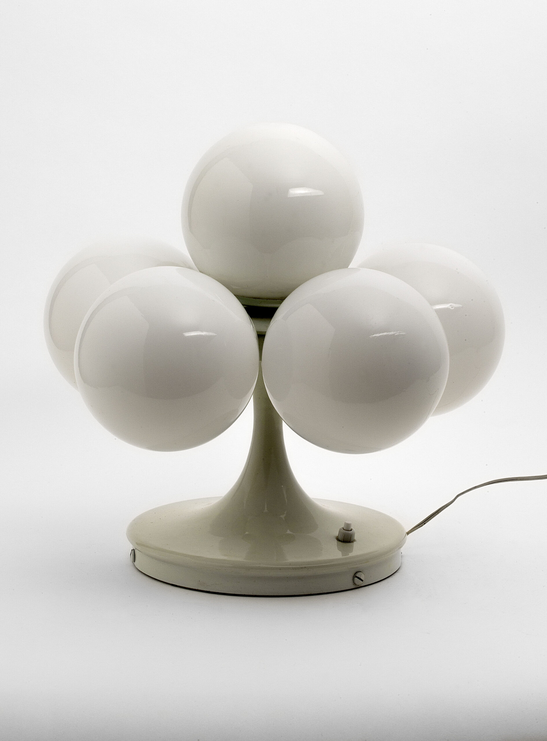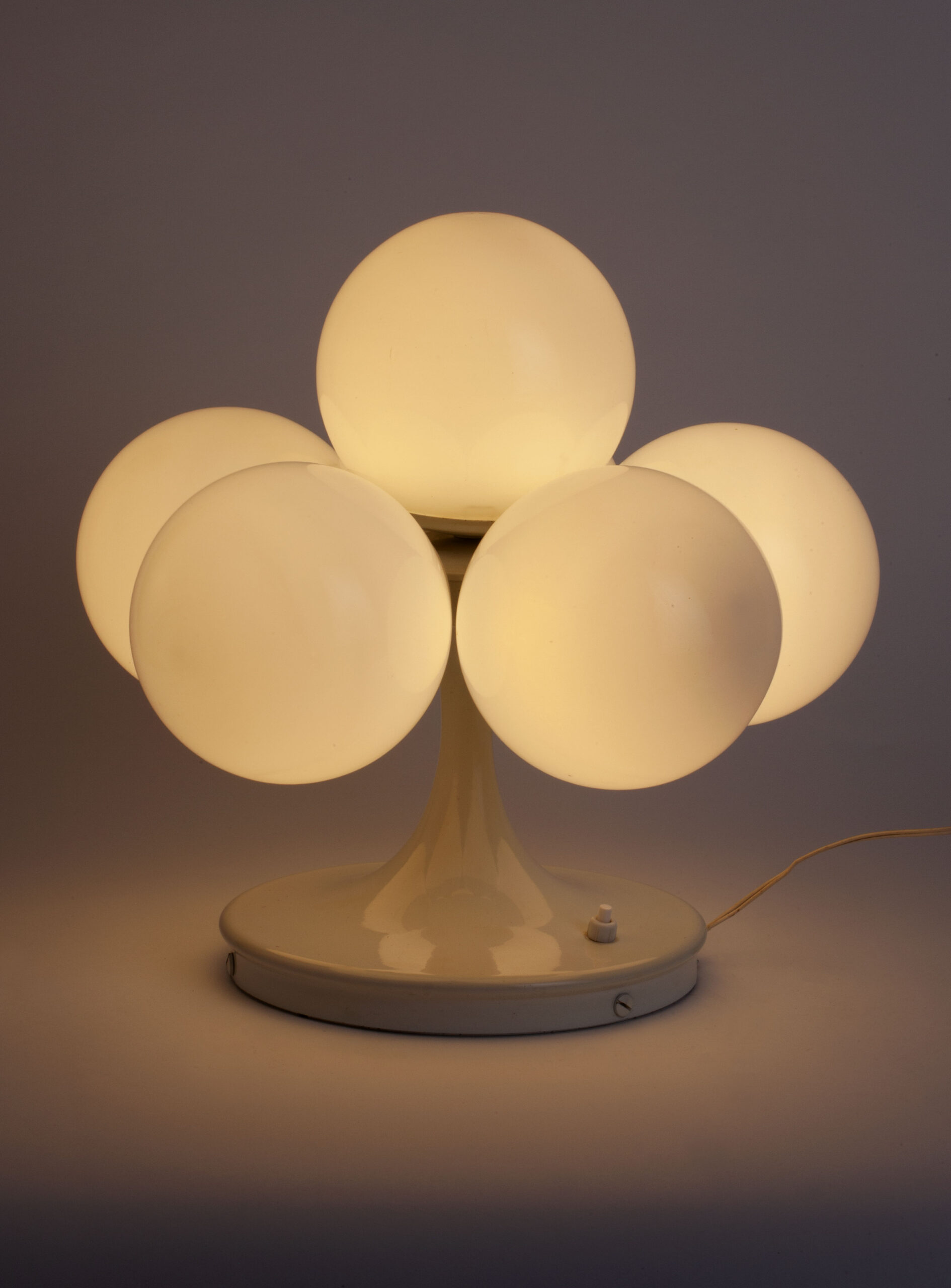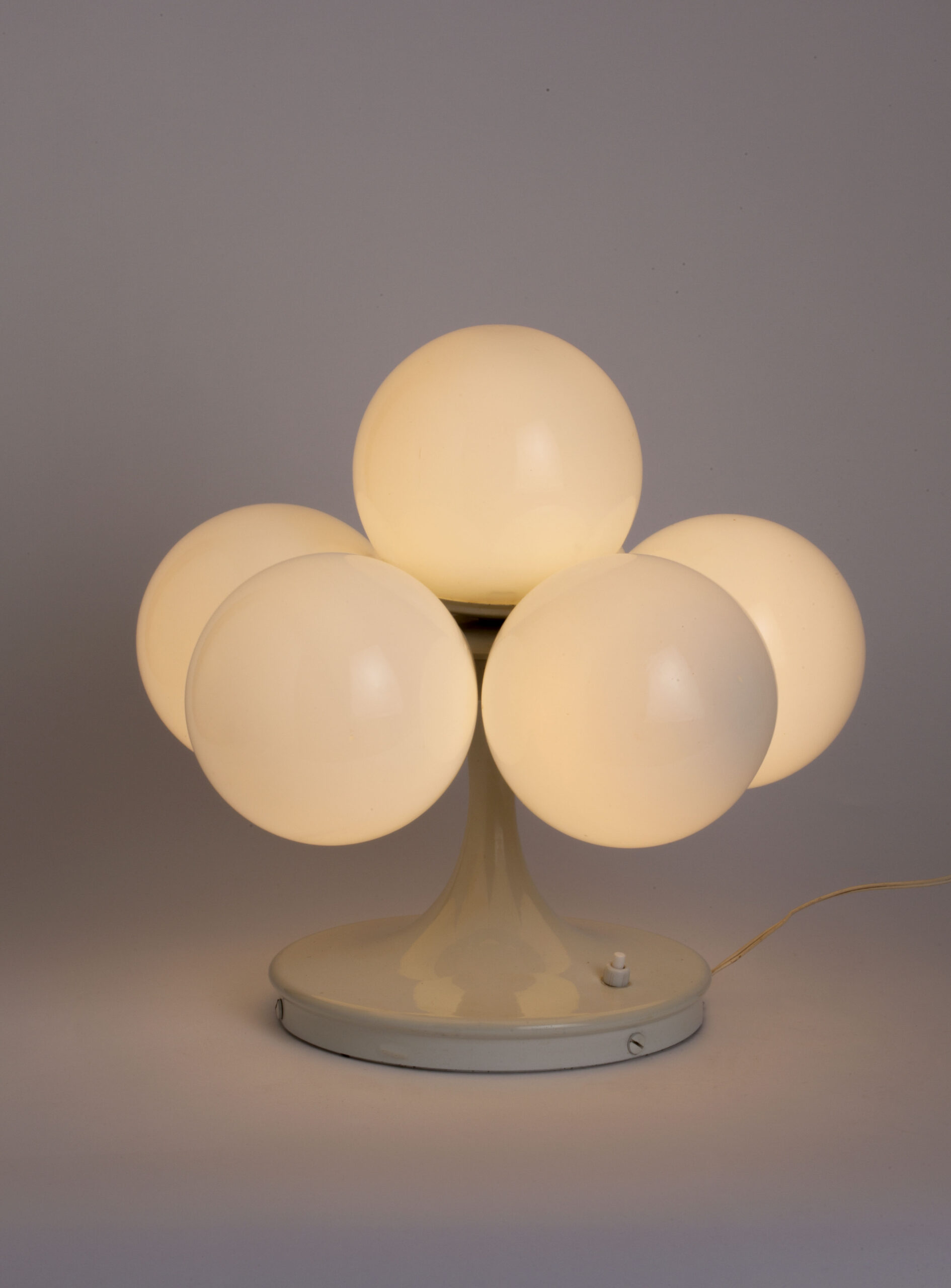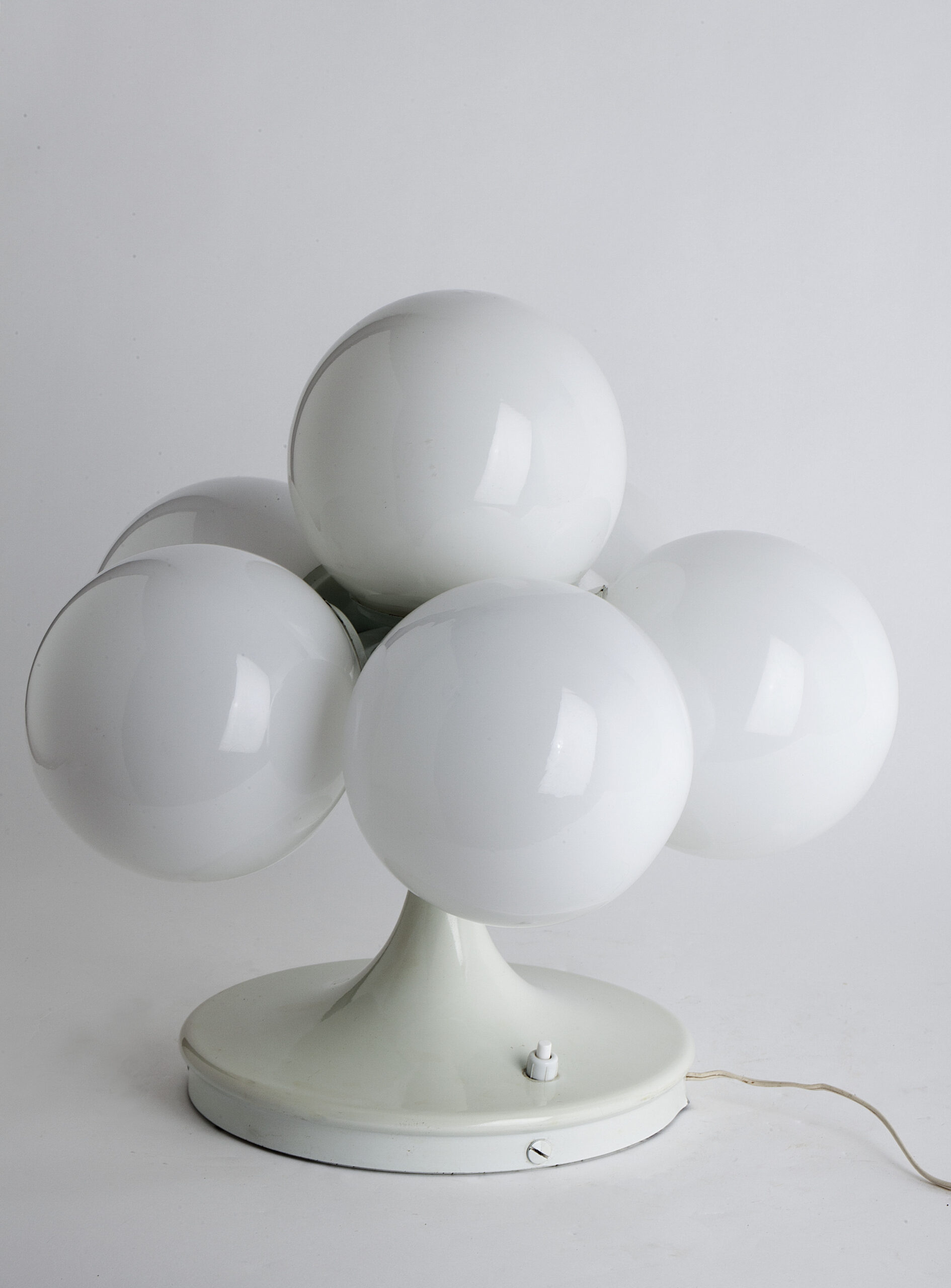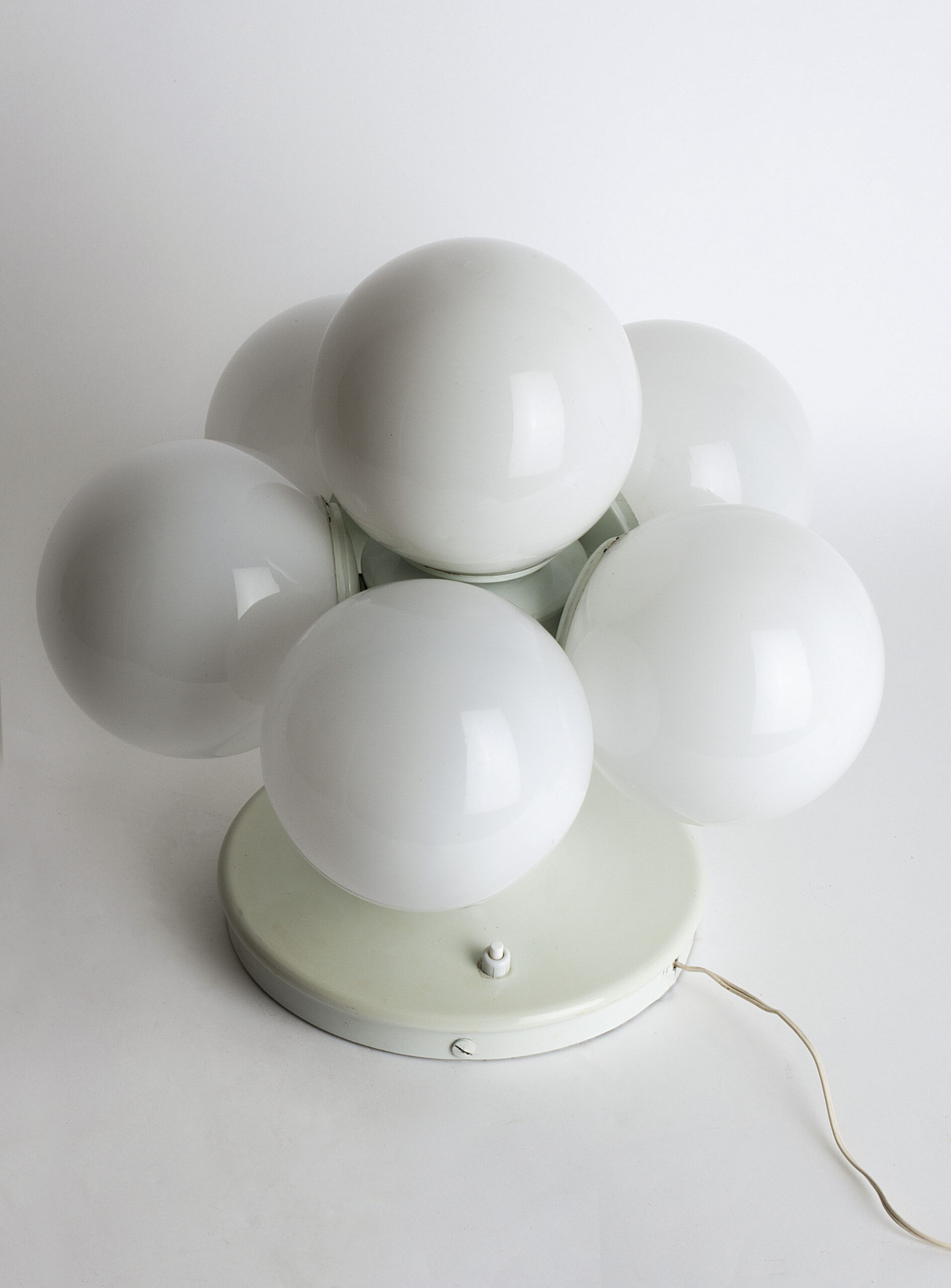Table lamp with five globe-shaped lampshades in opaline glass, produced by the Spanish brand Lyma in the 1970s.