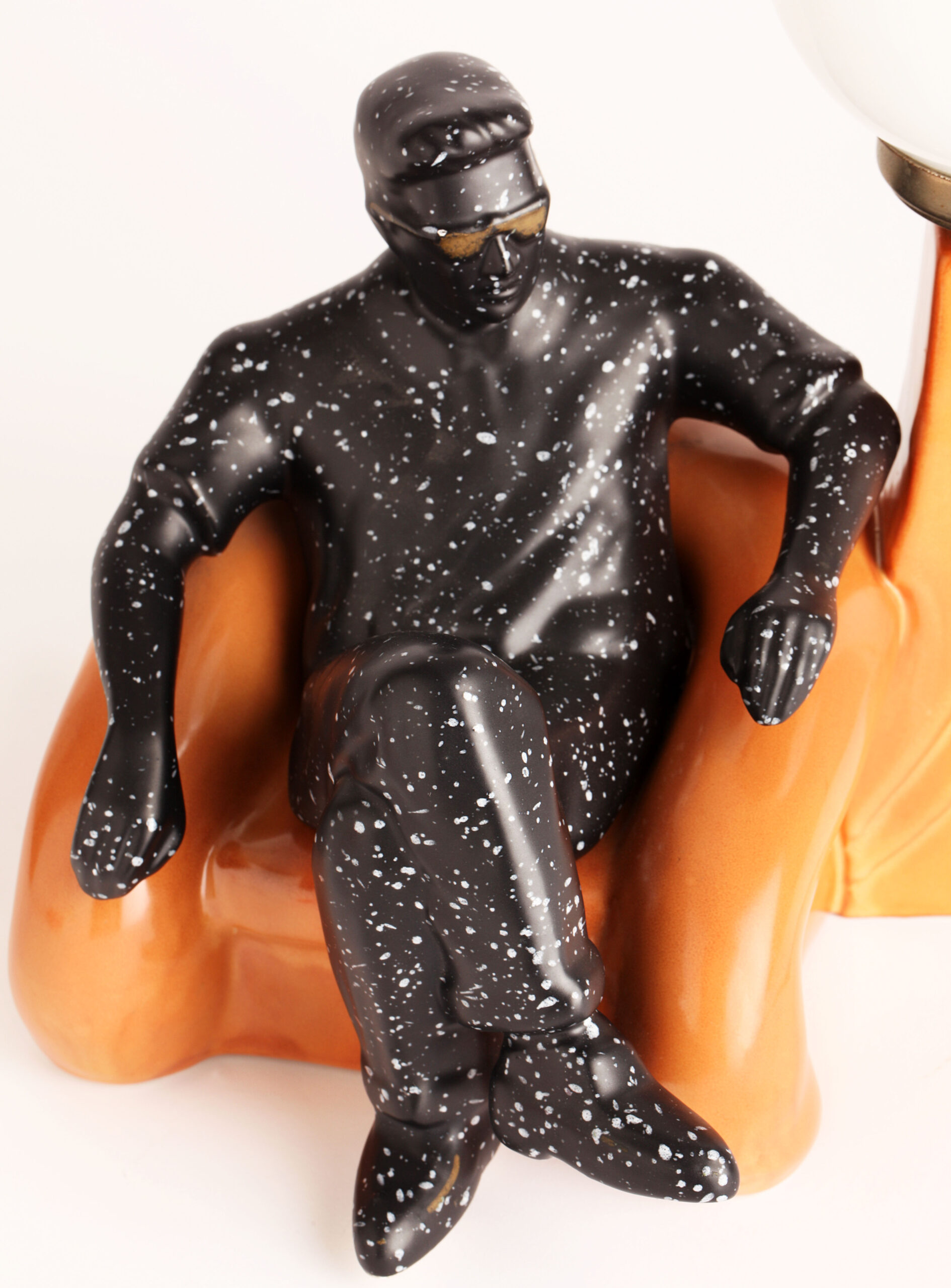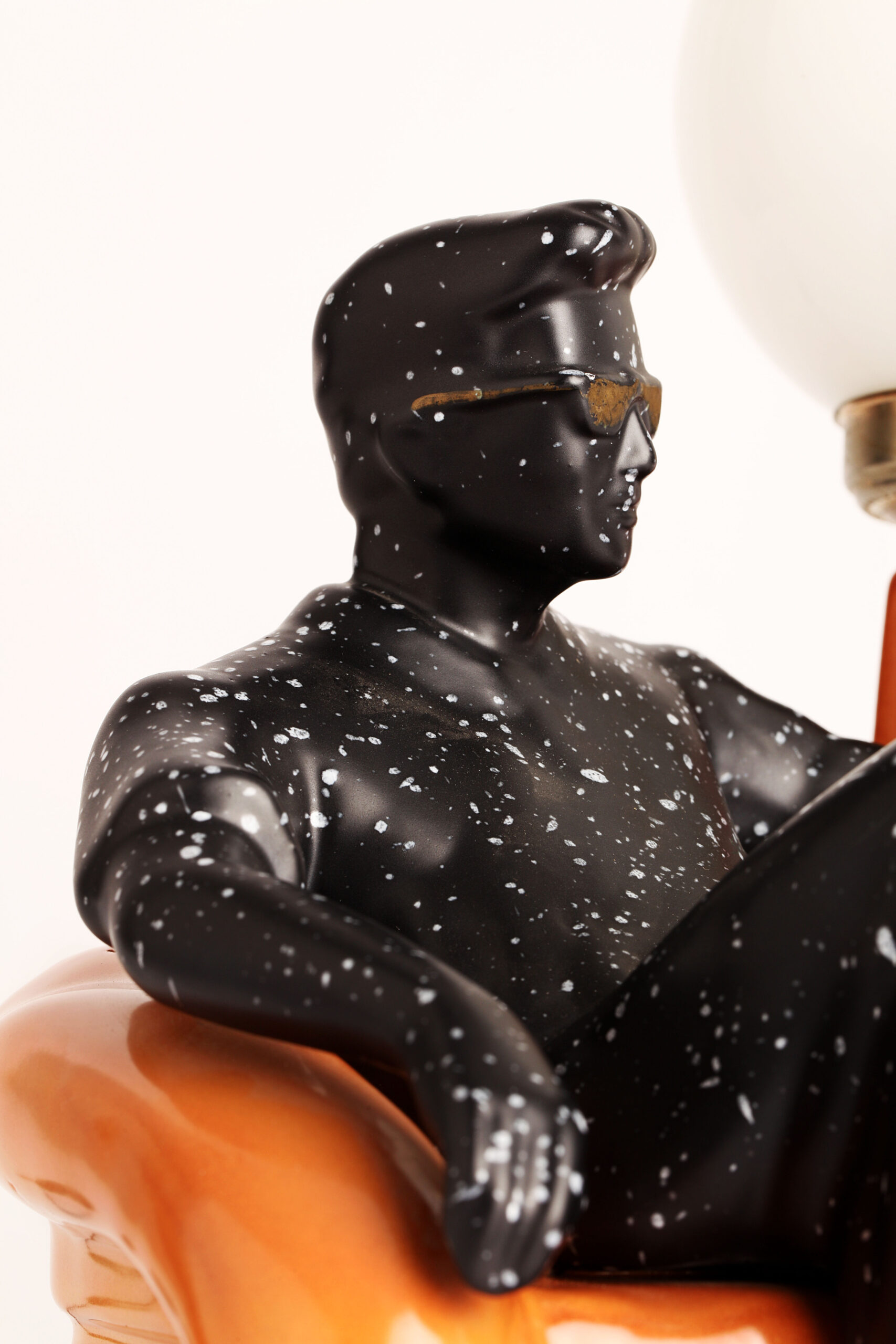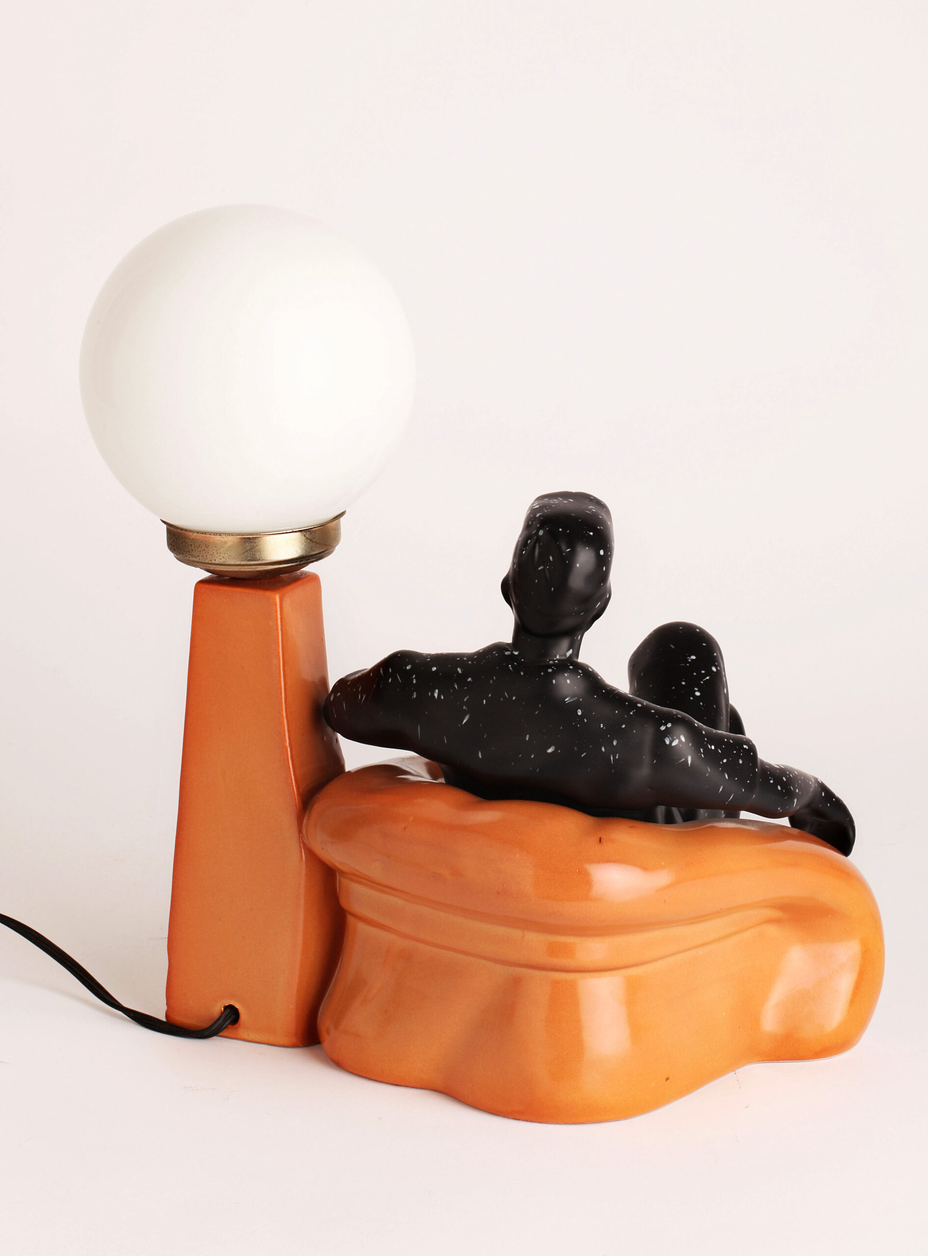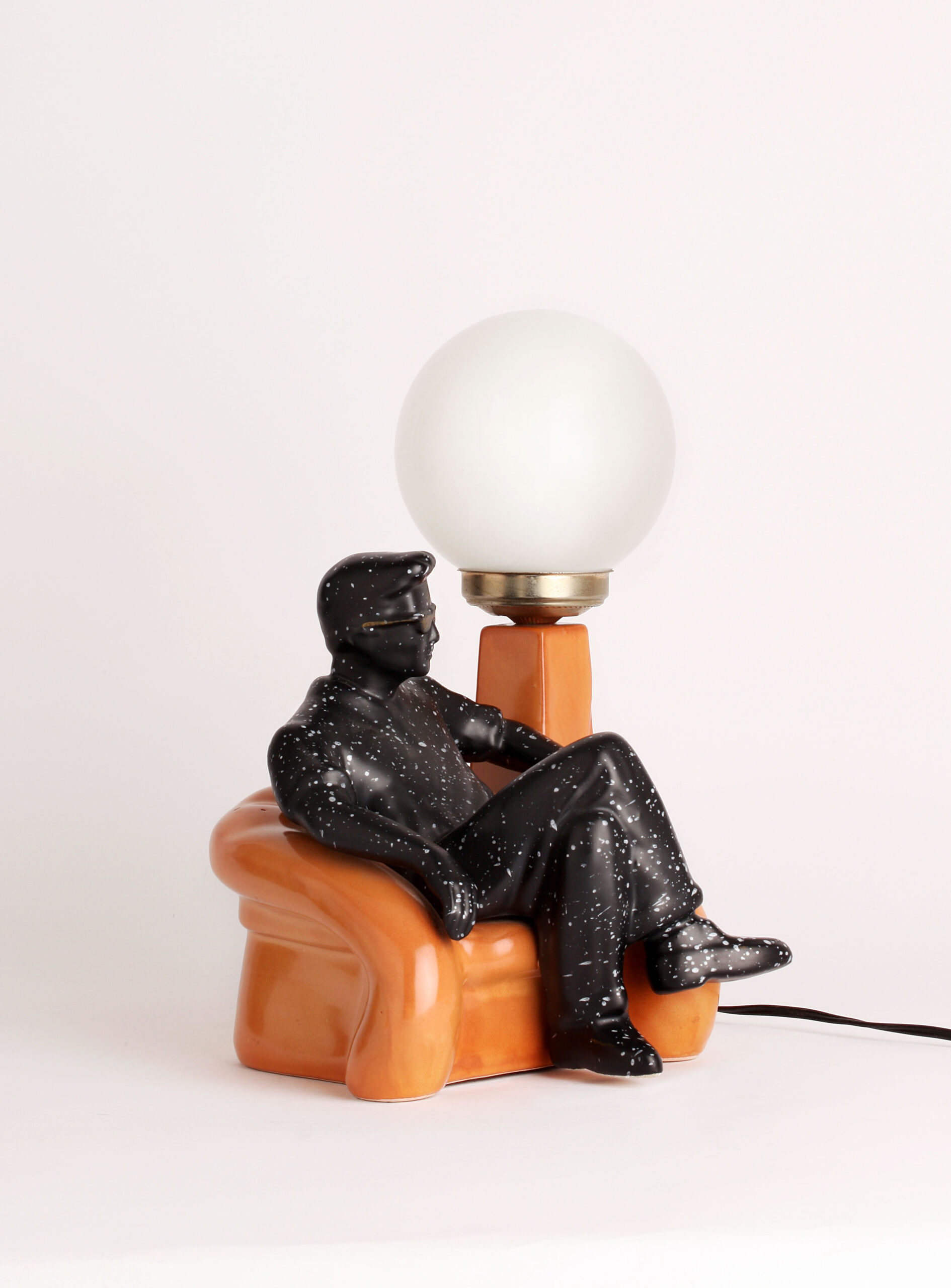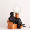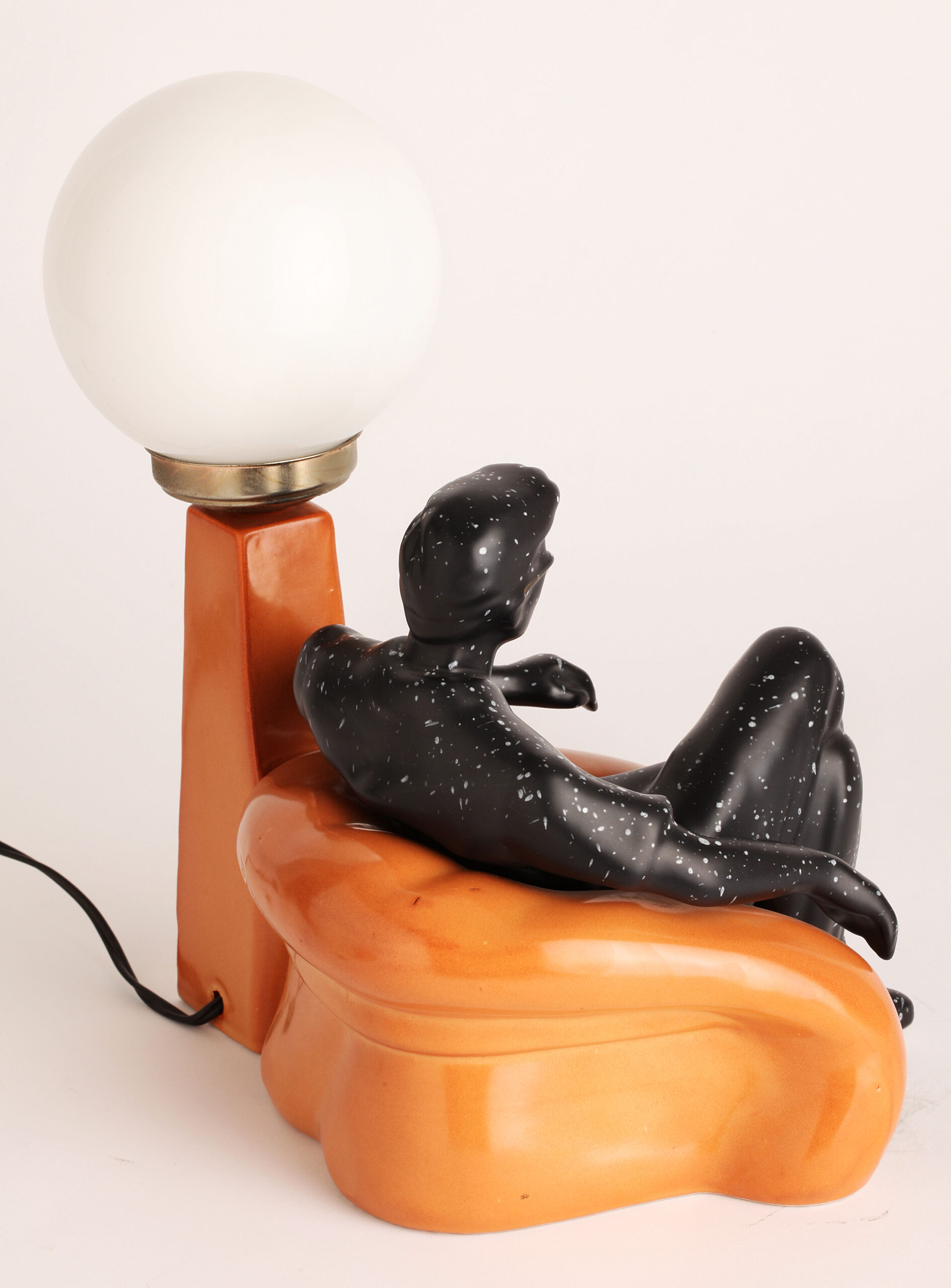 Man resting on a sofa Vintage ceramic table lamp from the 80´s Opaline glass shade and original wiring Good condition!
