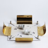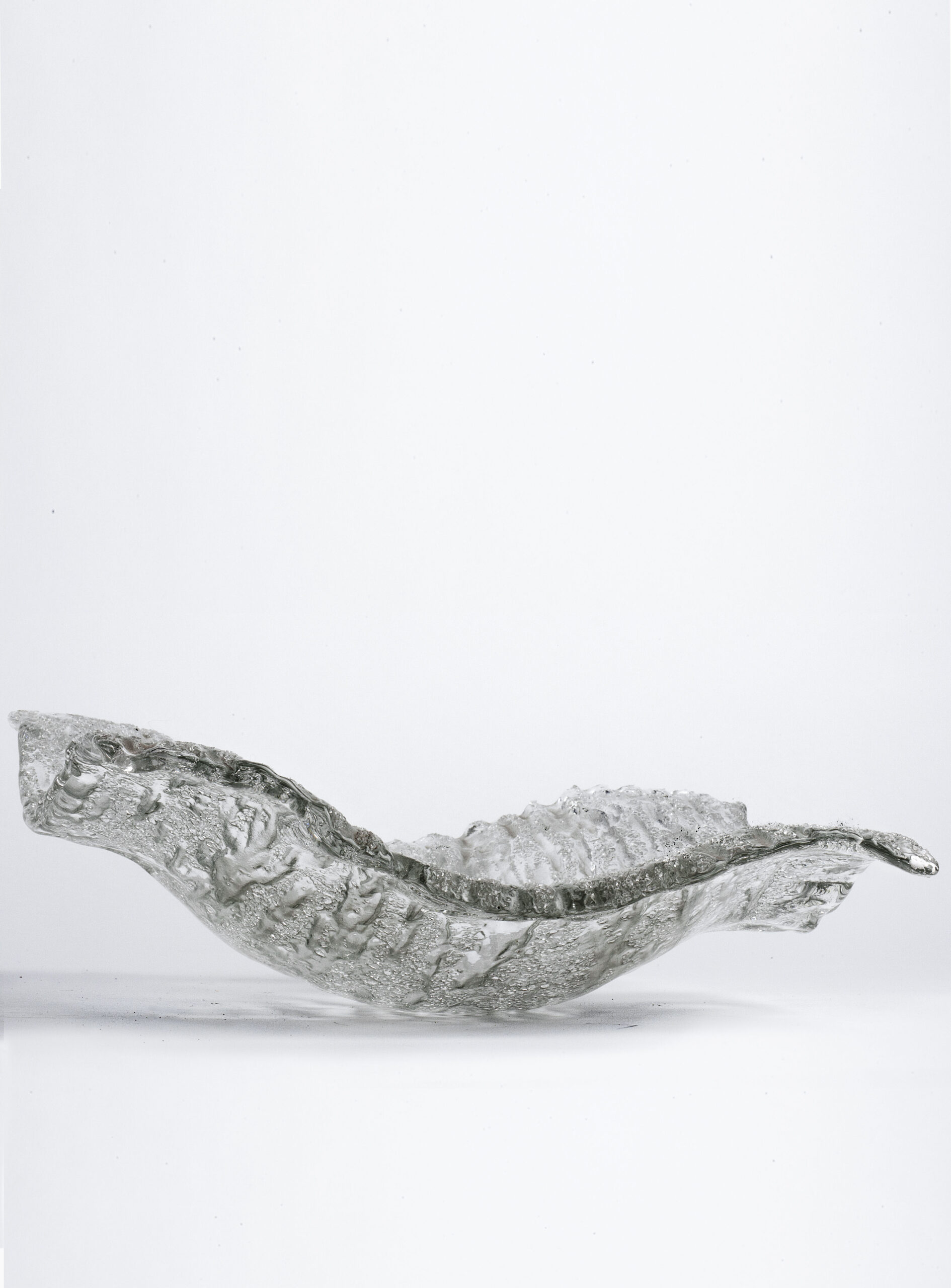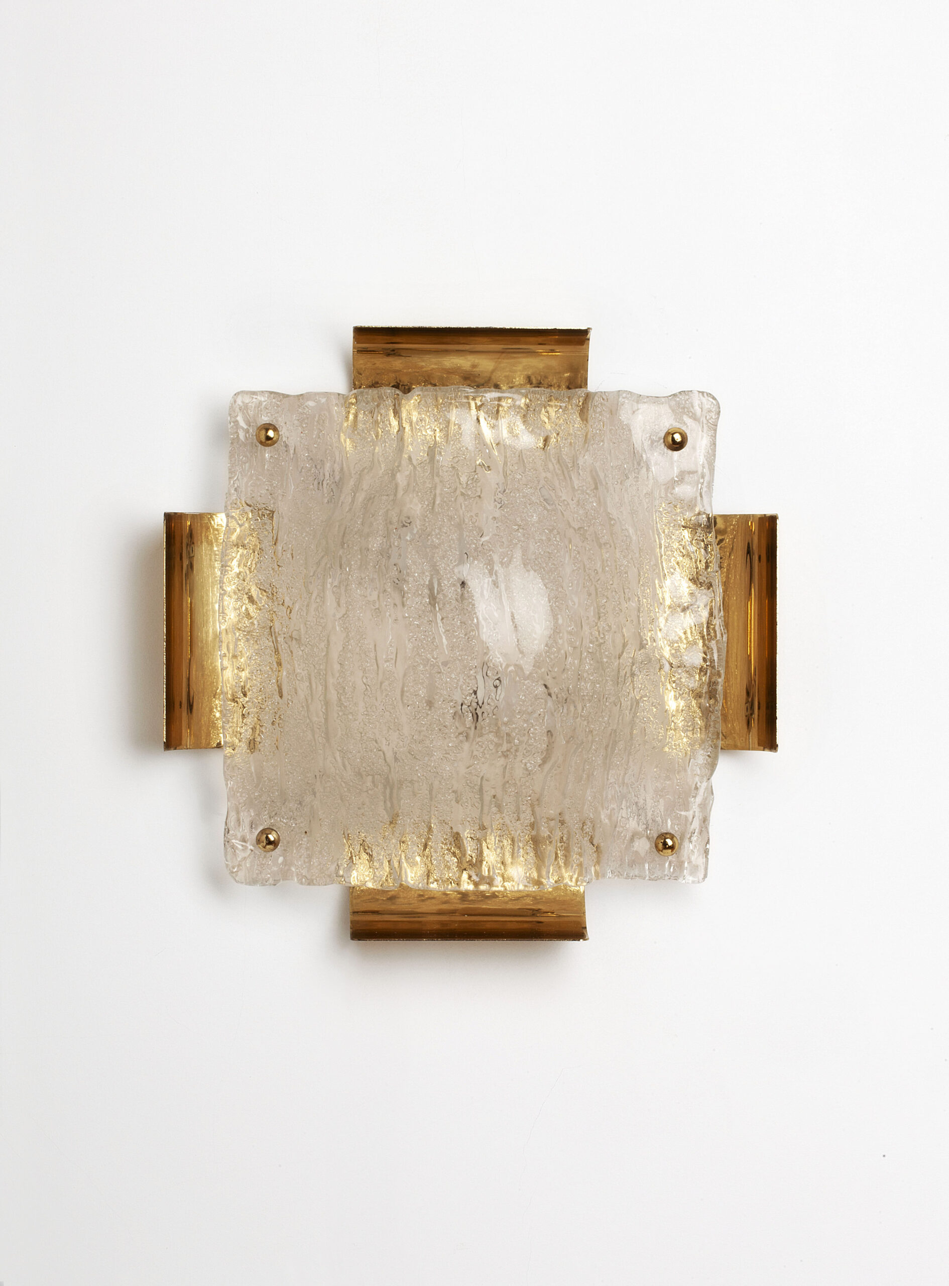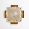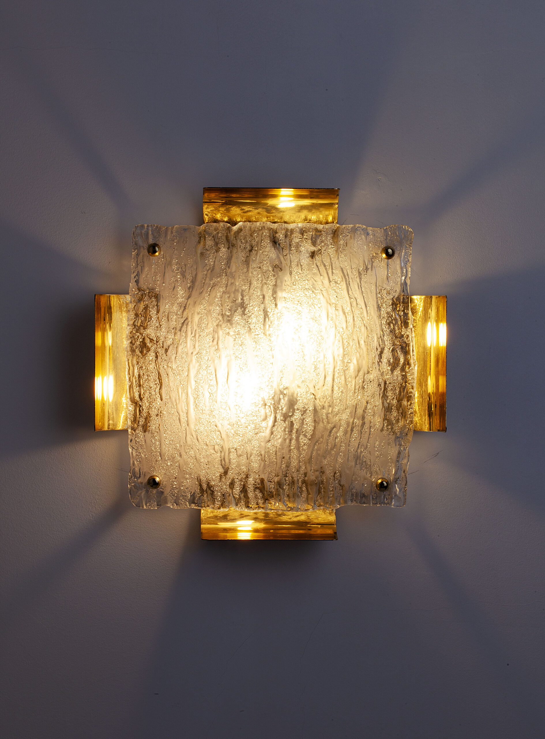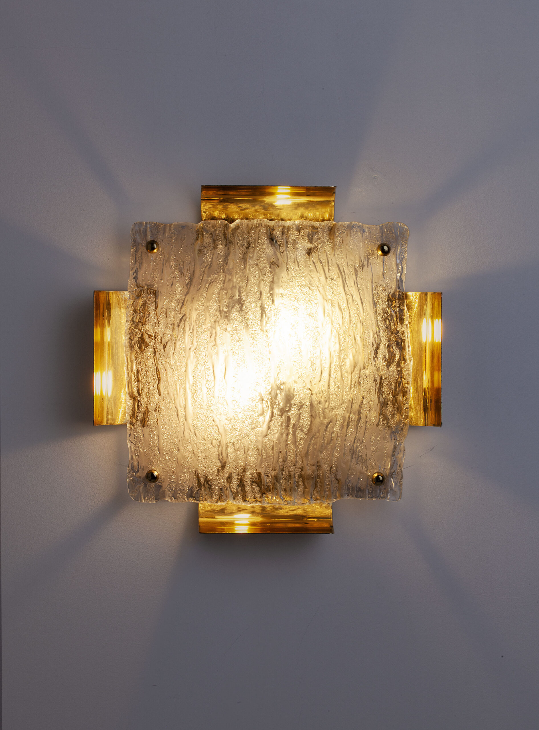 The lamp consists of a square brass structure and a curved glass shade with an ice texture spreading light in a warm way
