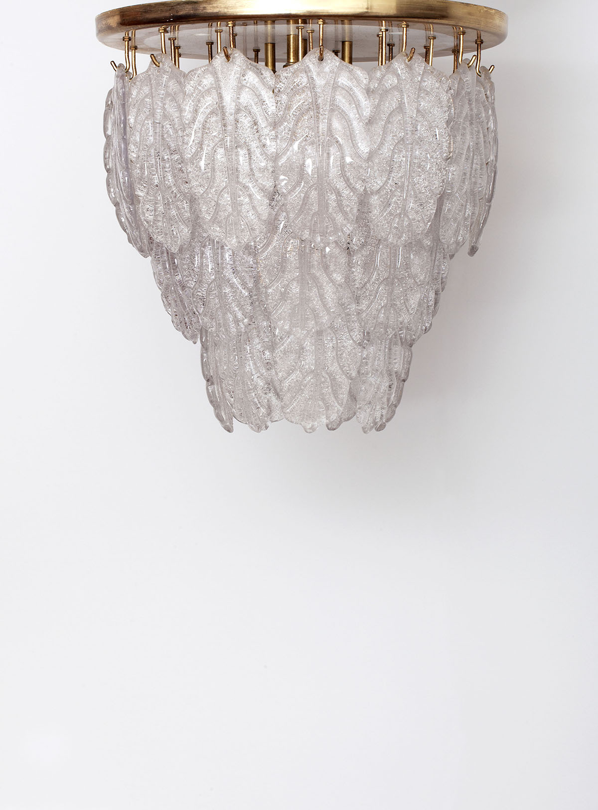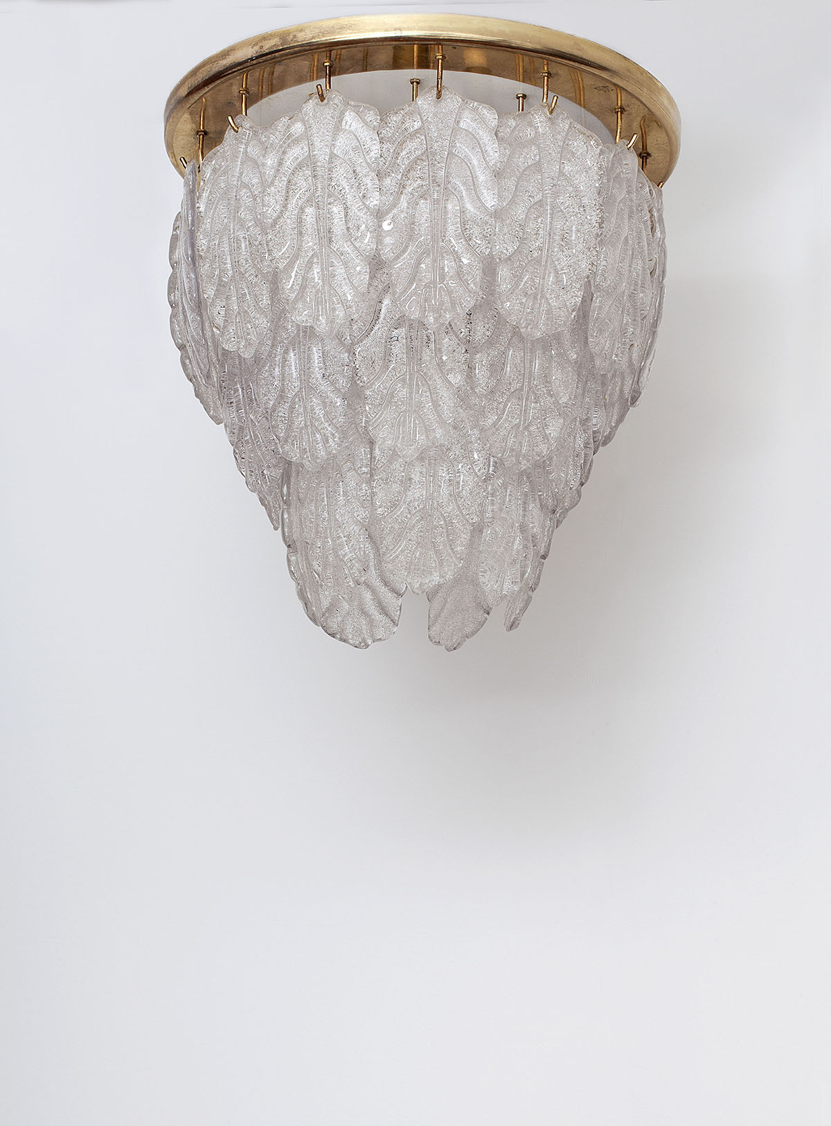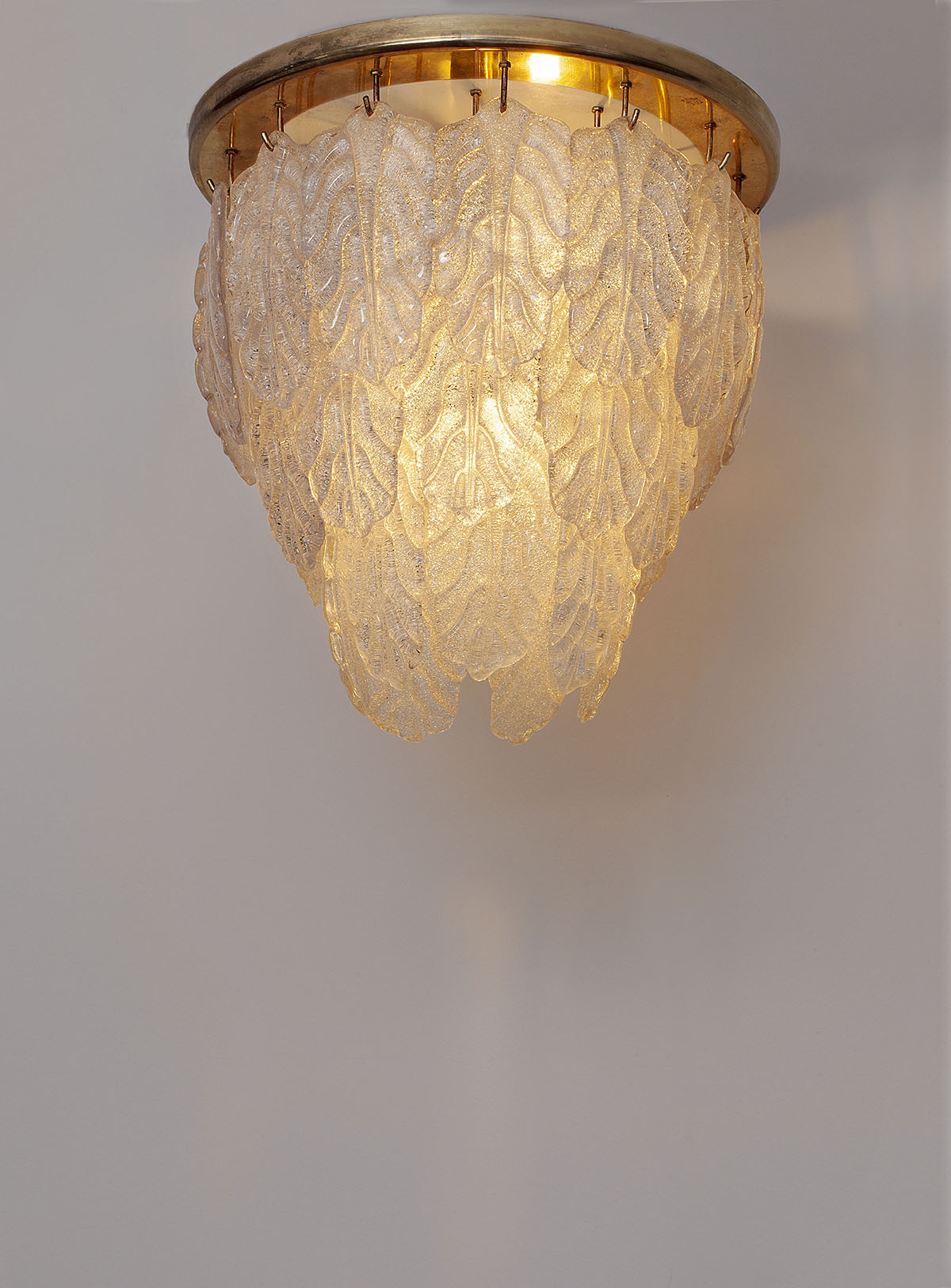 The lamp is composed of a metal plate from which 30 leaves of Murano are hanging.