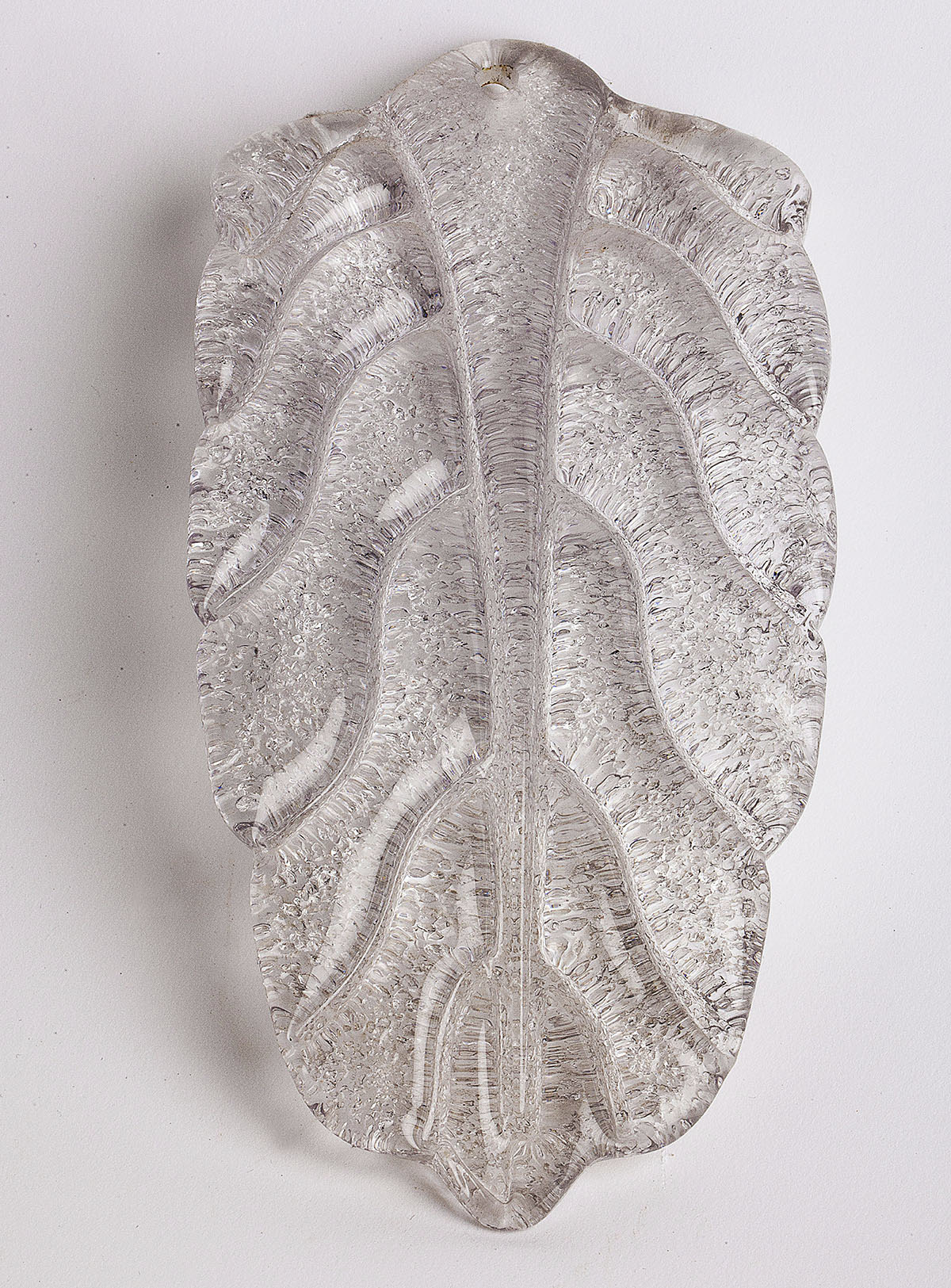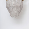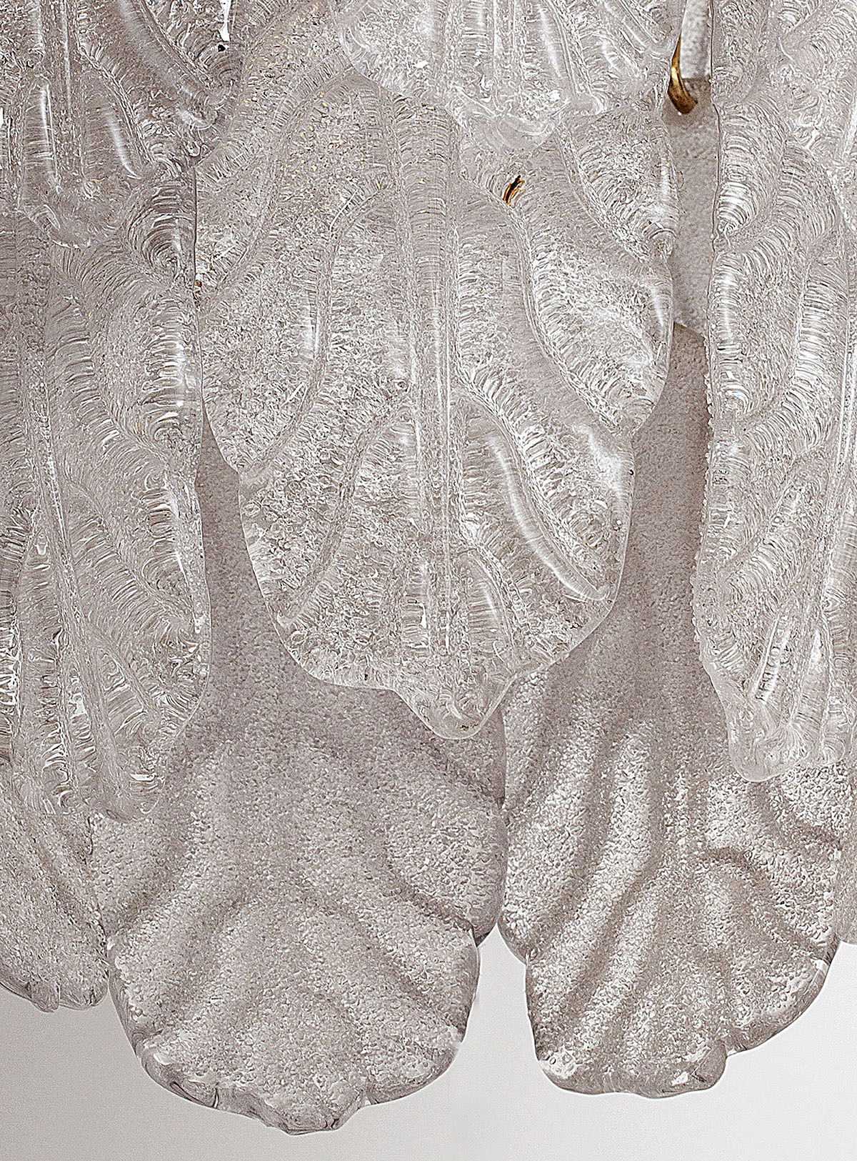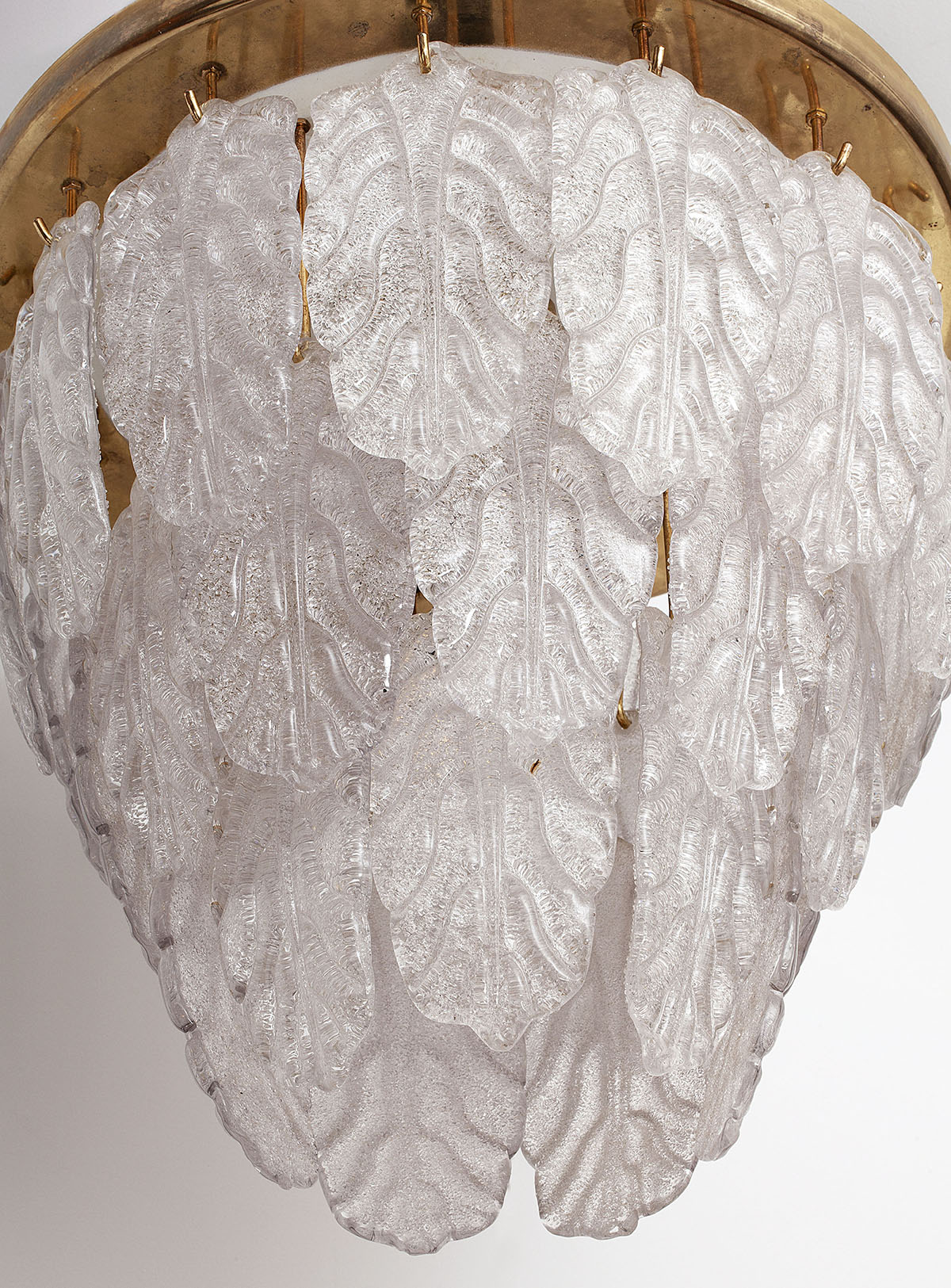 The lamp is composed of a metal plate from which 30 leaves of Murano are hanging.