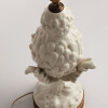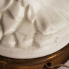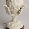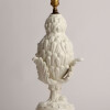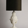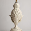 Base consisting of three large leaves supporting a column of abstract curvilinear reliefs.