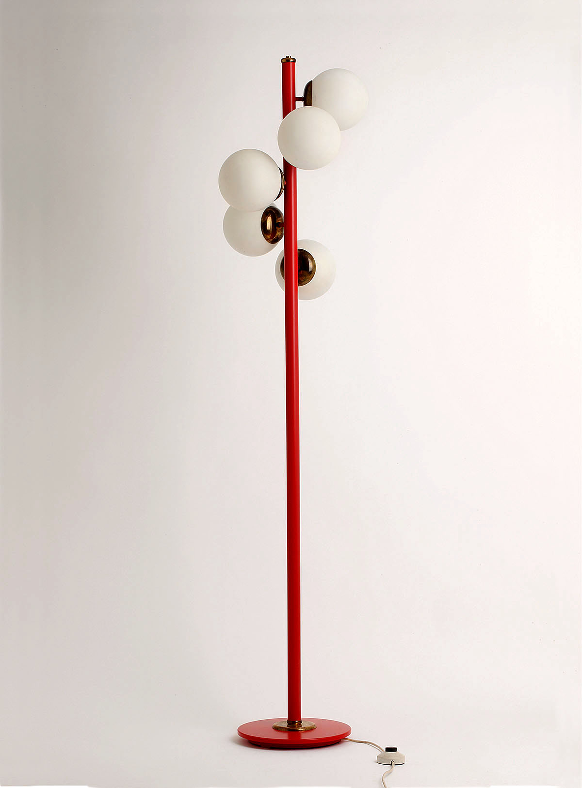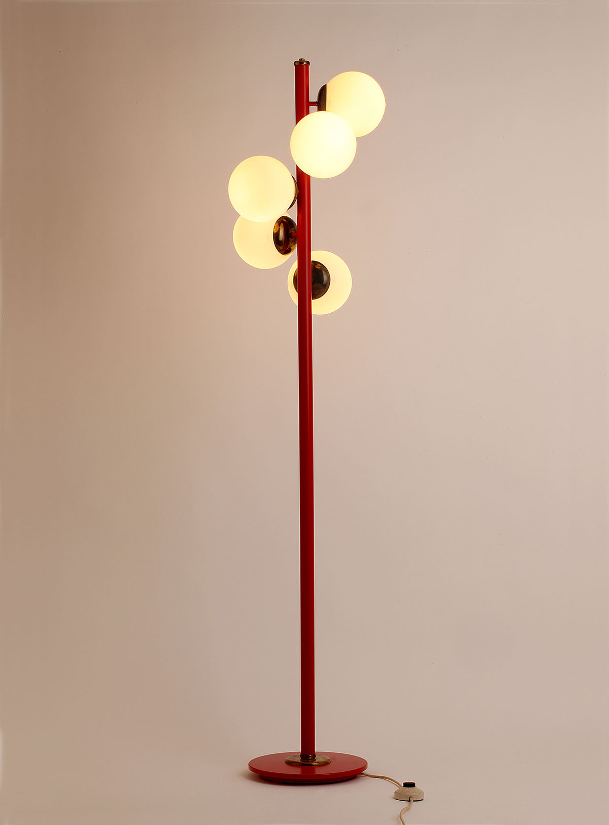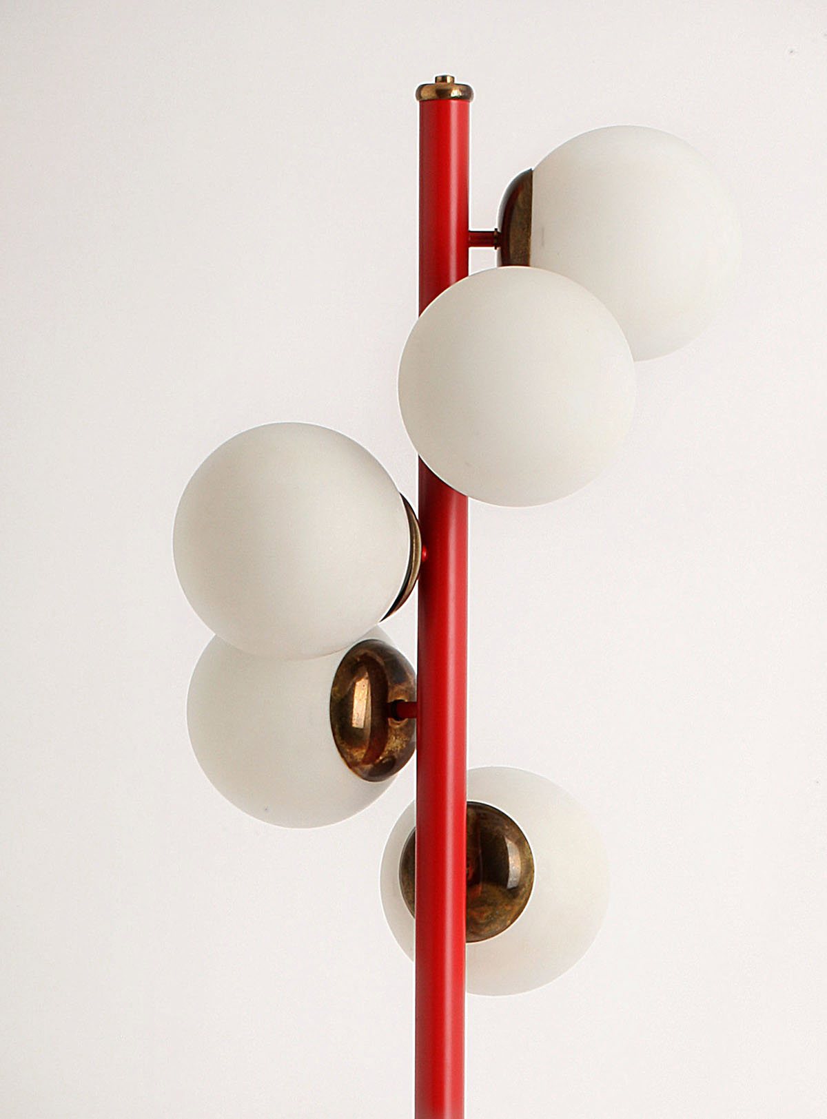 Vintage floor lamp from the 60s. Rubi red lacquered metal base and 5 opaline glass lampshades arranged in a spiral representing the moovment of the moon. the lamp is in excellent condition. The red lacquer as new.