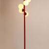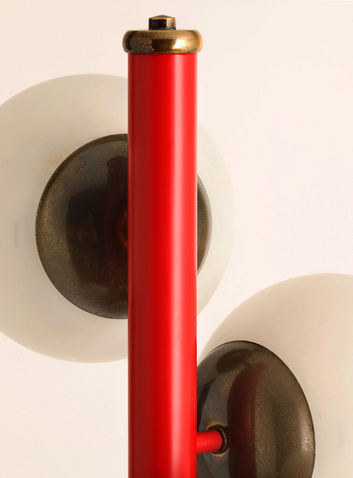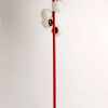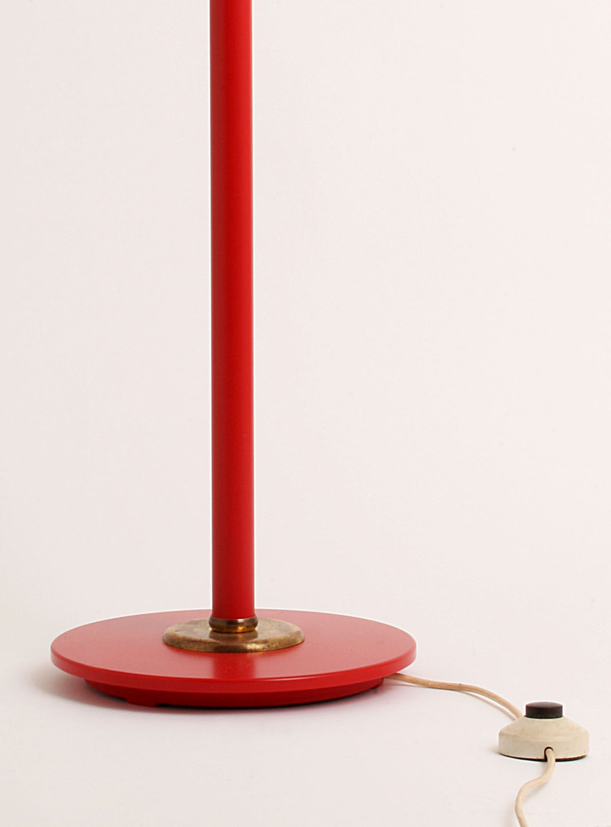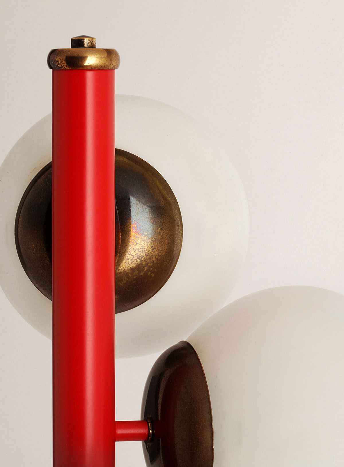 Vintage floor lamp from the 60s. Rubi red lacquered metal base and 5 opaline glass lampshades arranged in a spiral representing the moovment of the moon. the lamp is in excellent condition. The red lacquer as new.