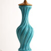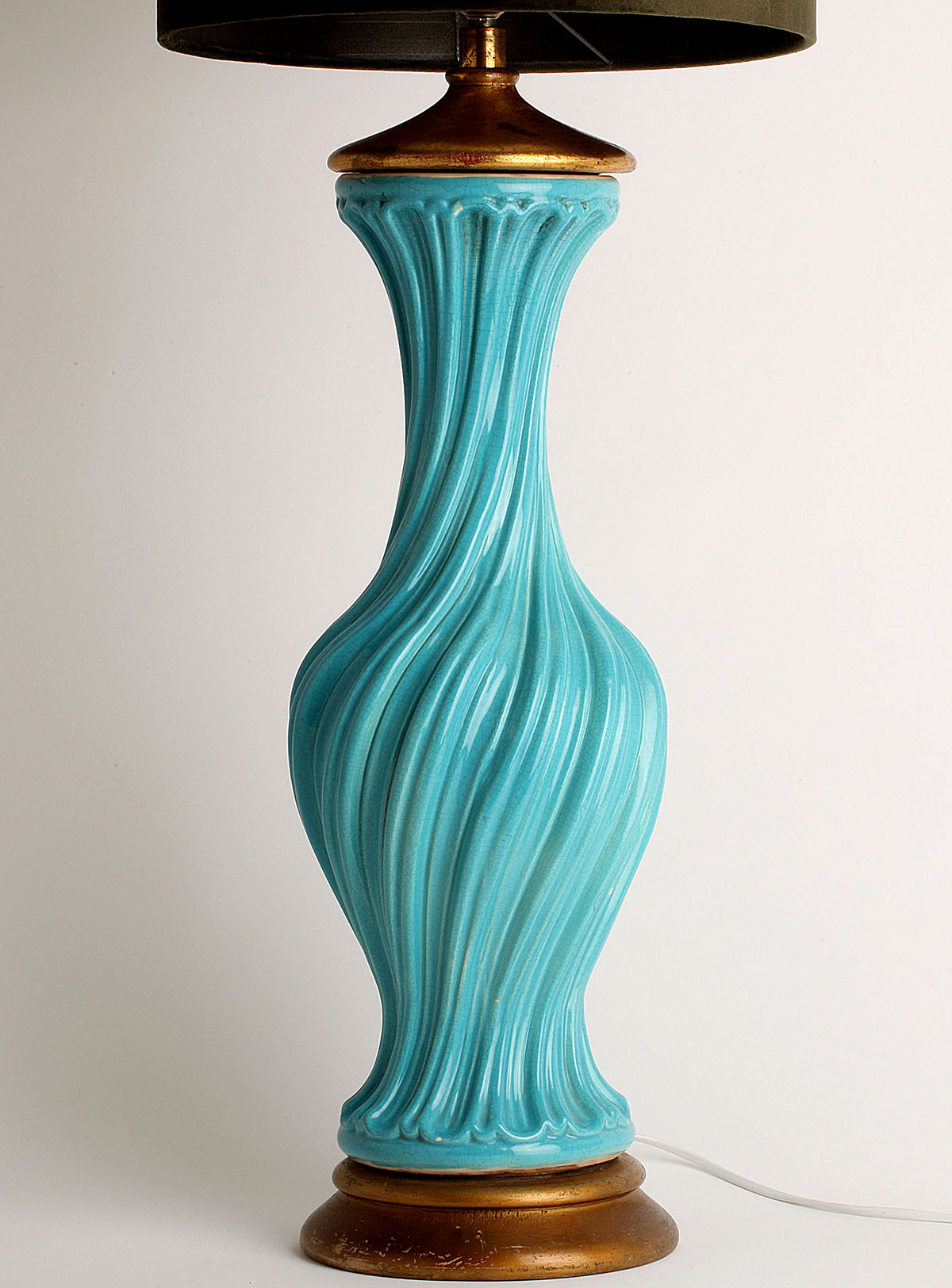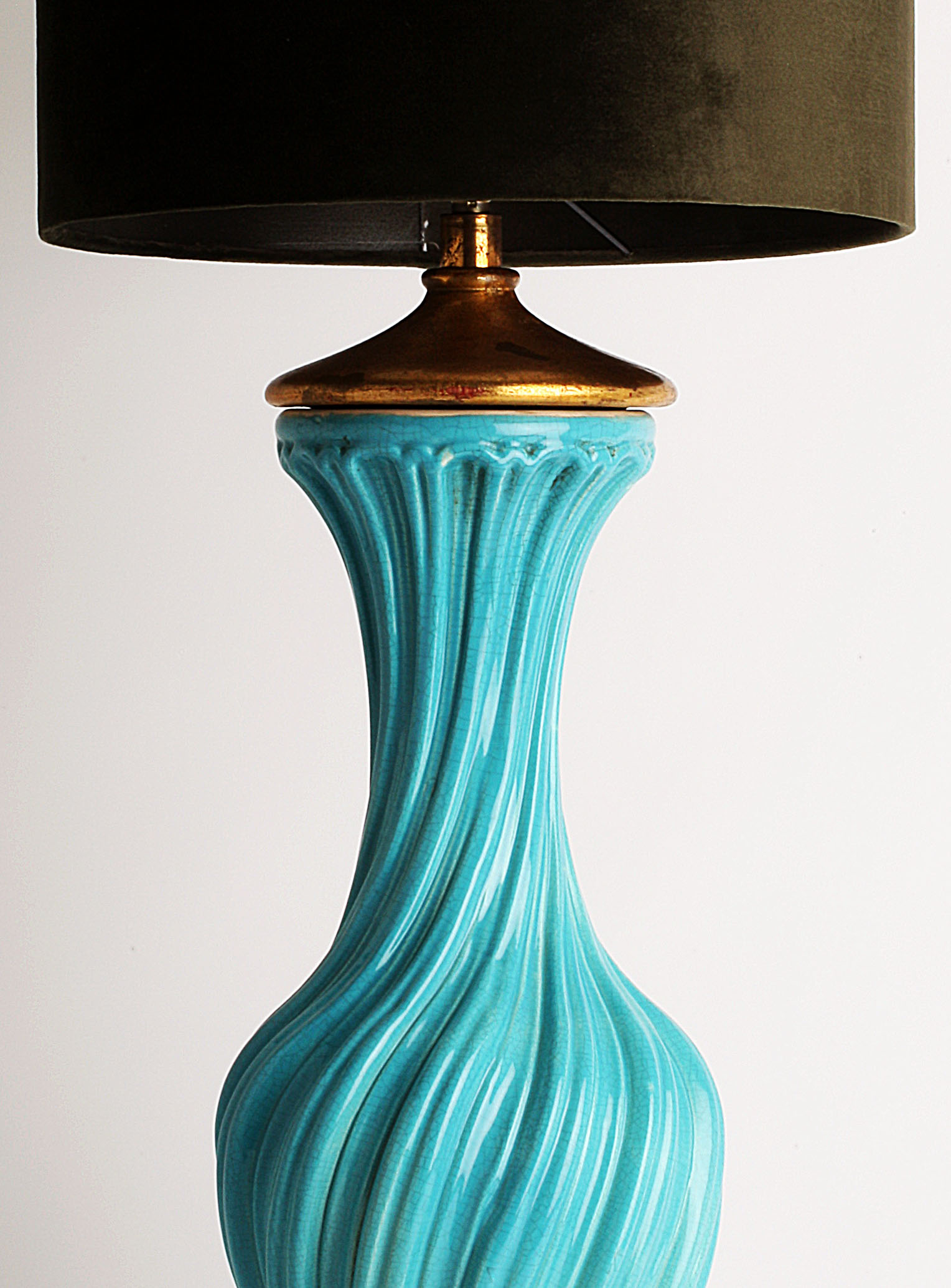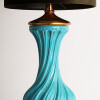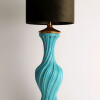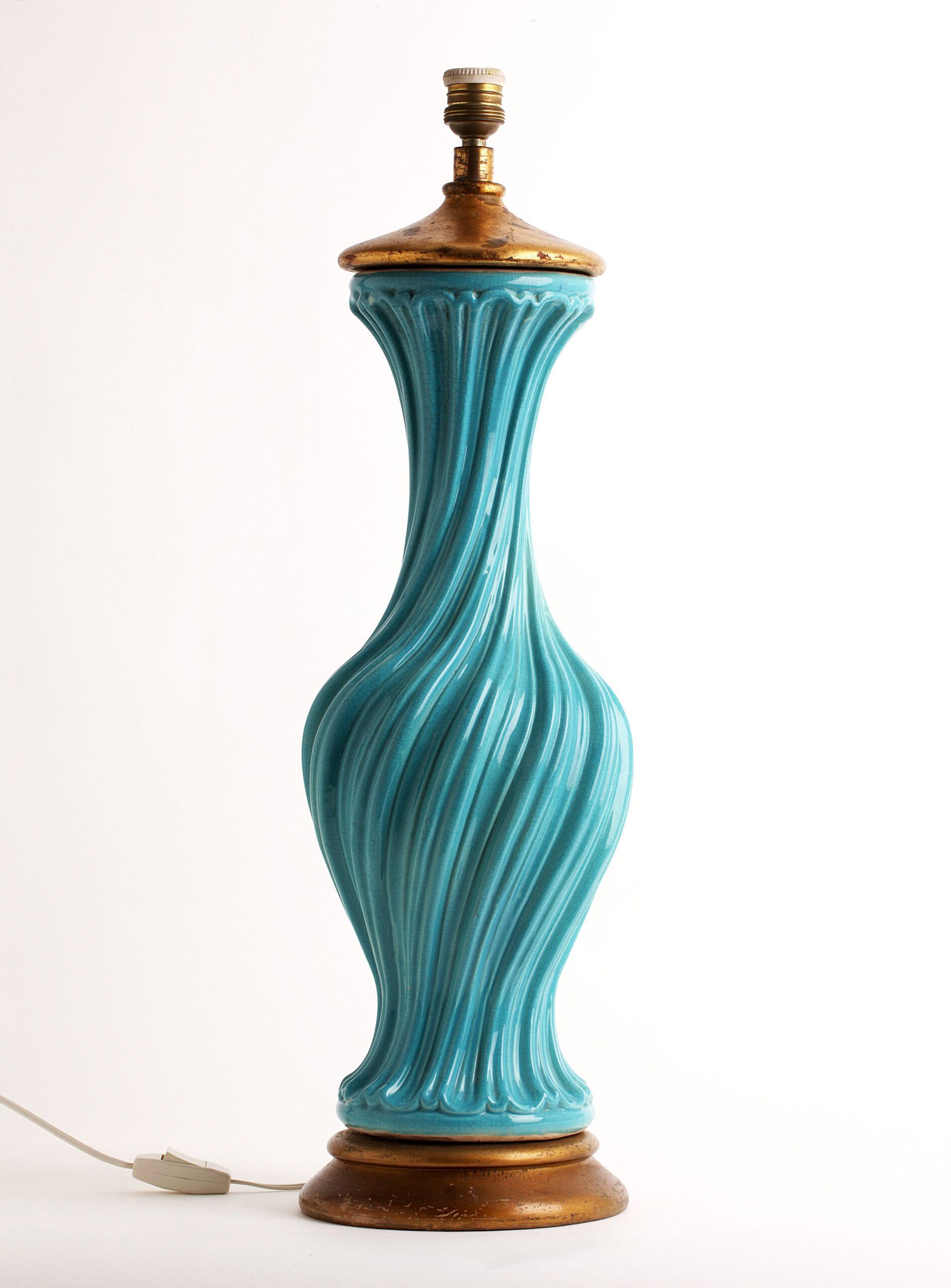 Spectacular turquoise ceramic table lamp from the 60s The swirl-shaped lamp twists on its axis. This large size lamp is made of crackle glazed ceramic with a gold leaf gilded wooden base and top It is in excellent condition.