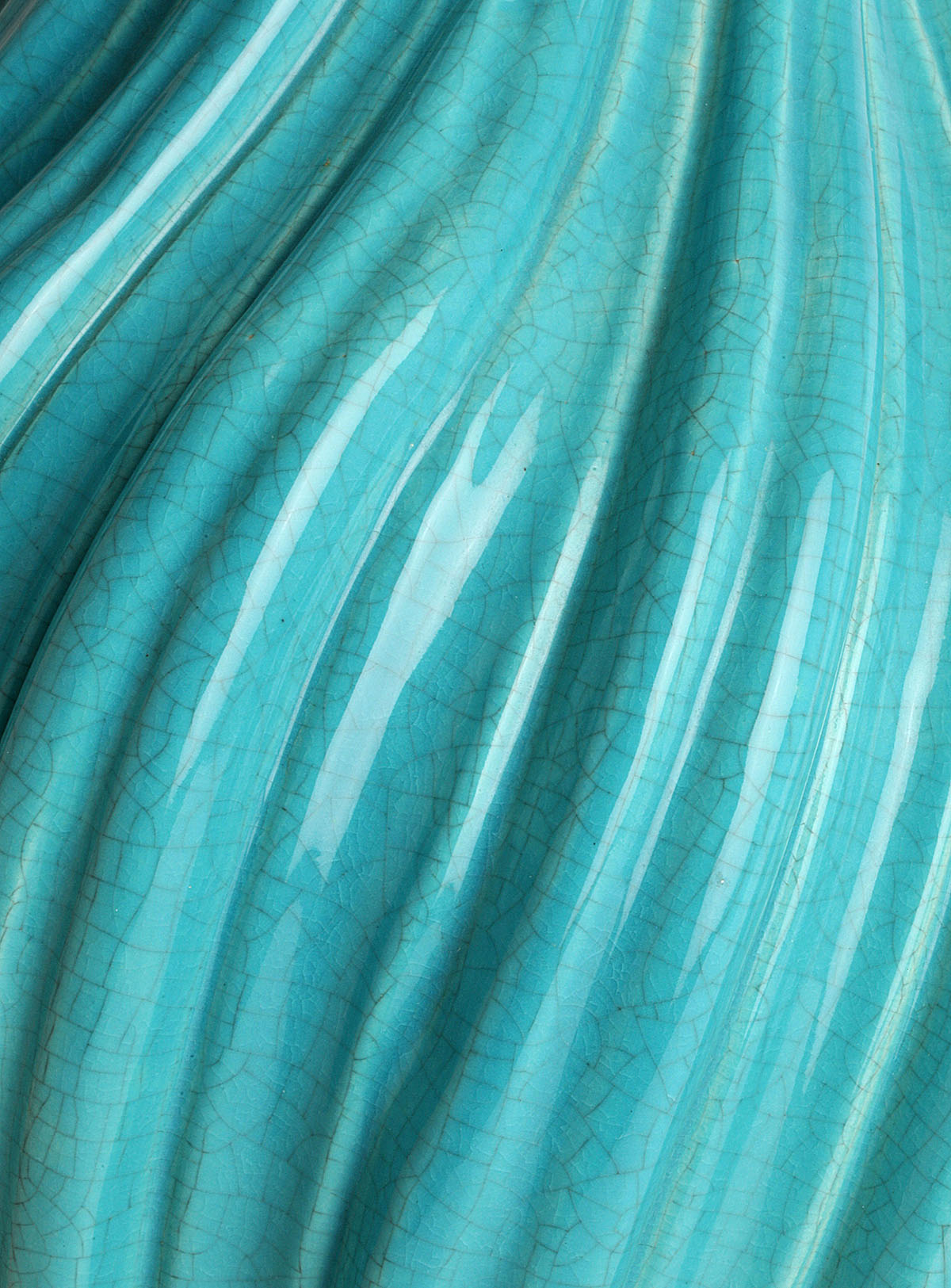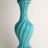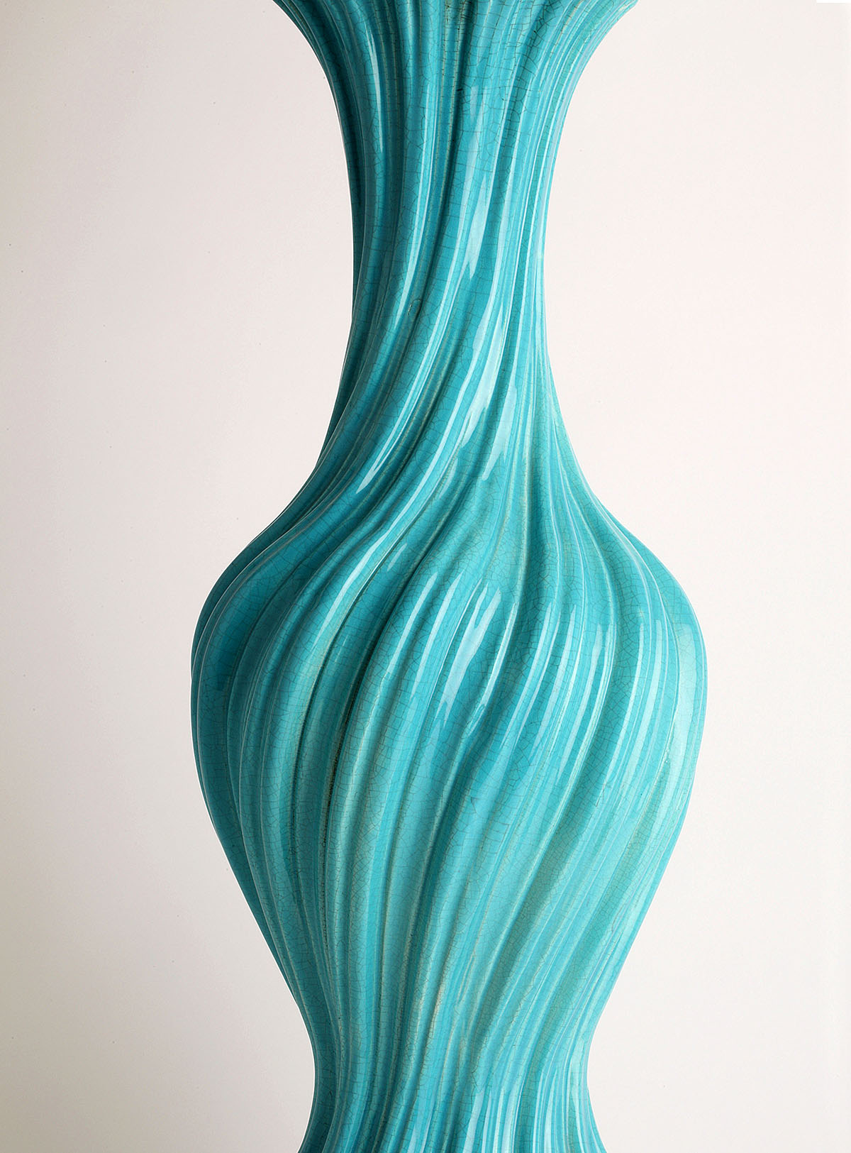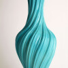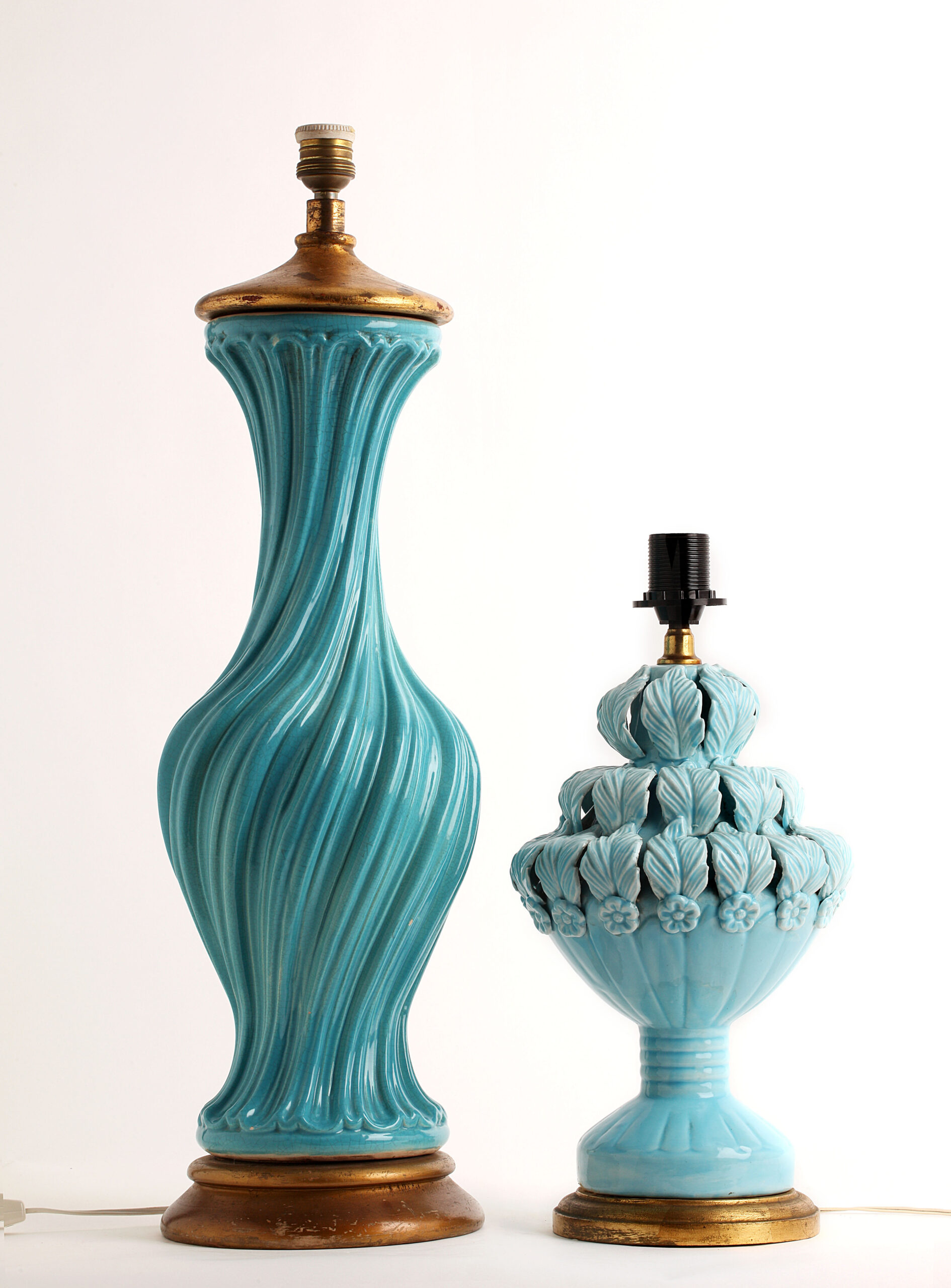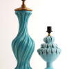 Spectacular turquoise ceramic table lamp from the 60s The swirl-shaped lamp twists on its axis. This large size lamp is made of crackle glazed ceramic with a gold leaf gilded wooden base and top It is in excellent condition.