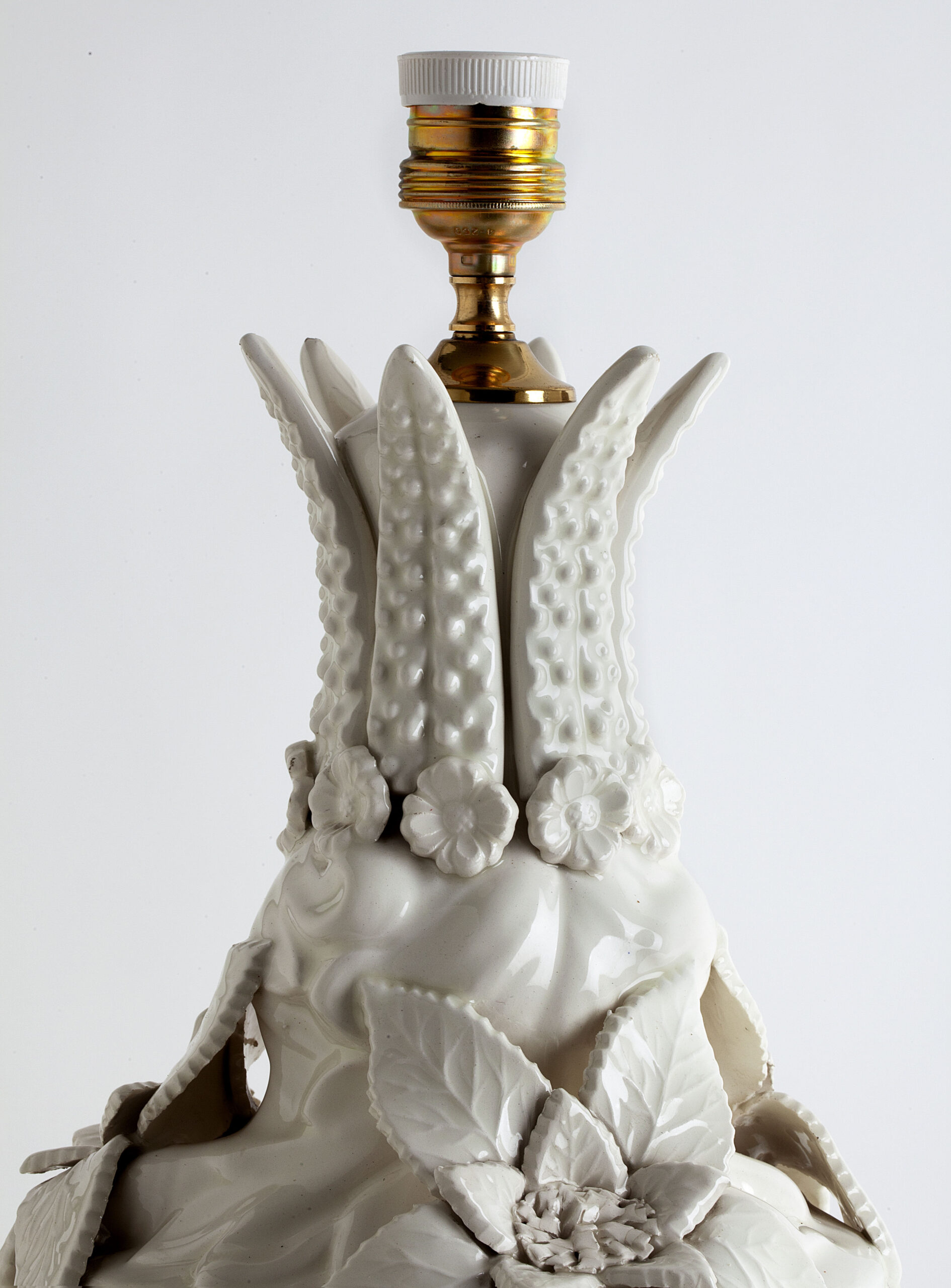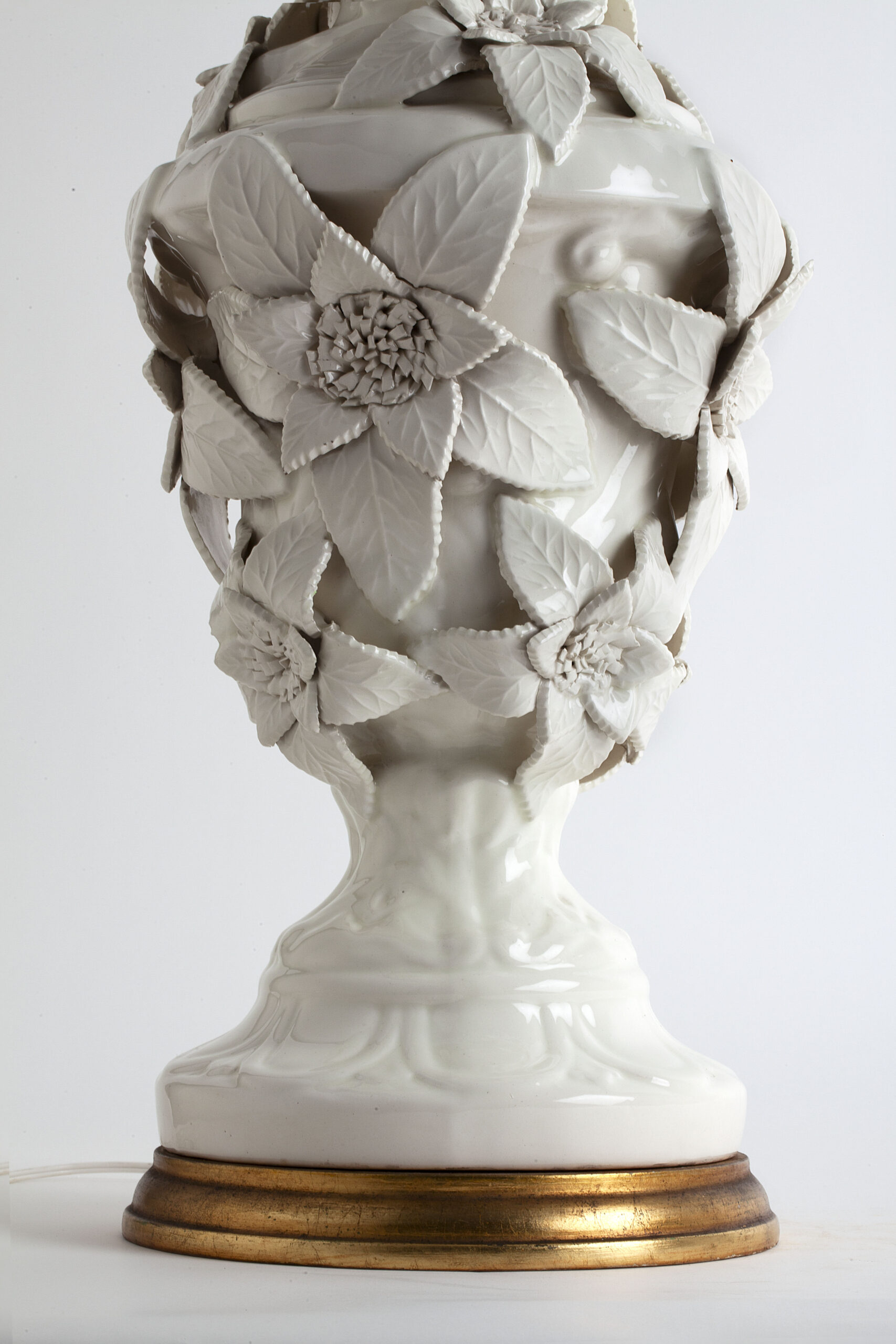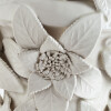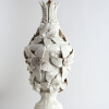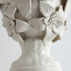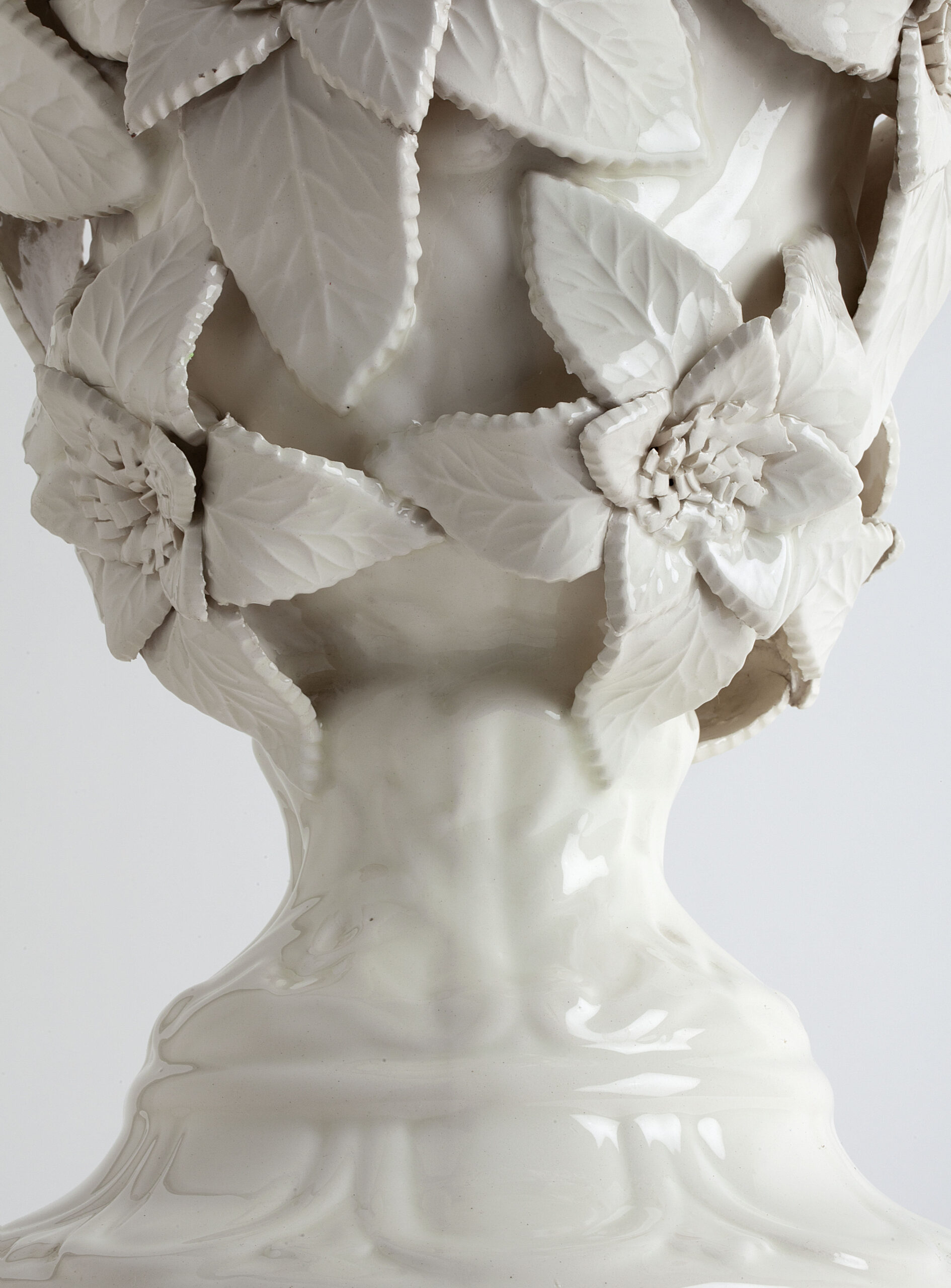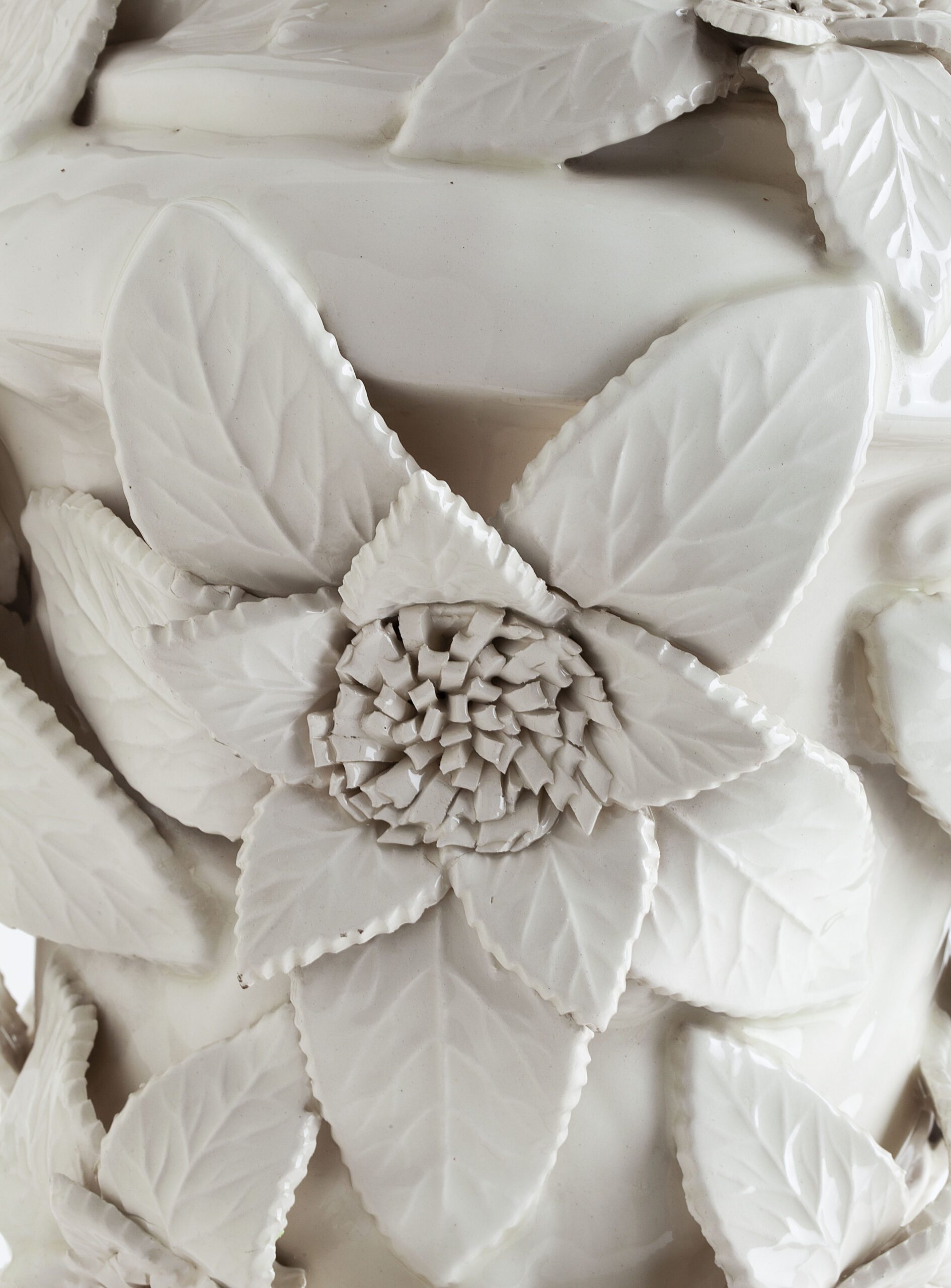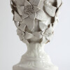 White glazed ceramic in the shape of a vase covered with large flowers.