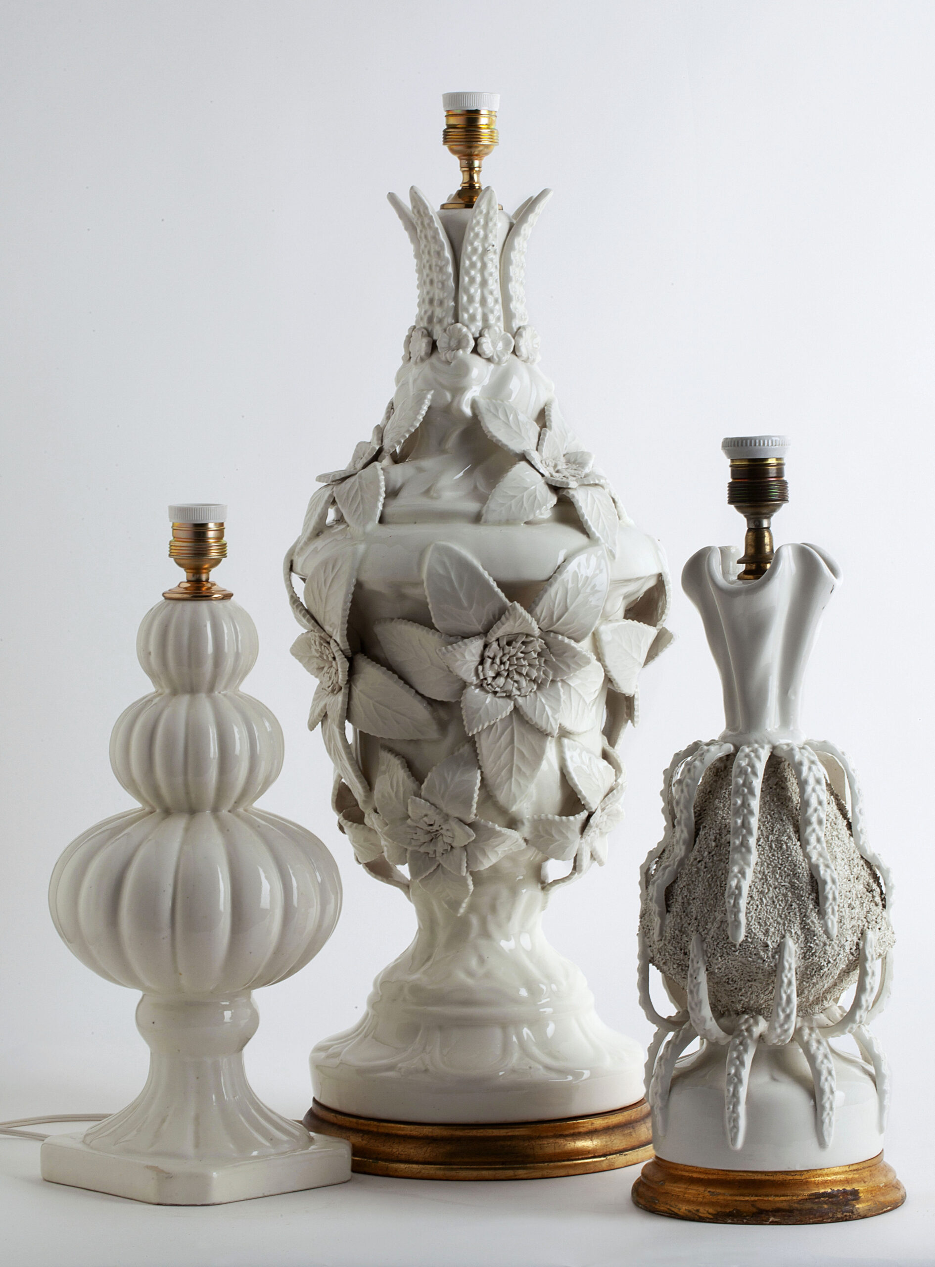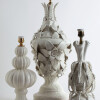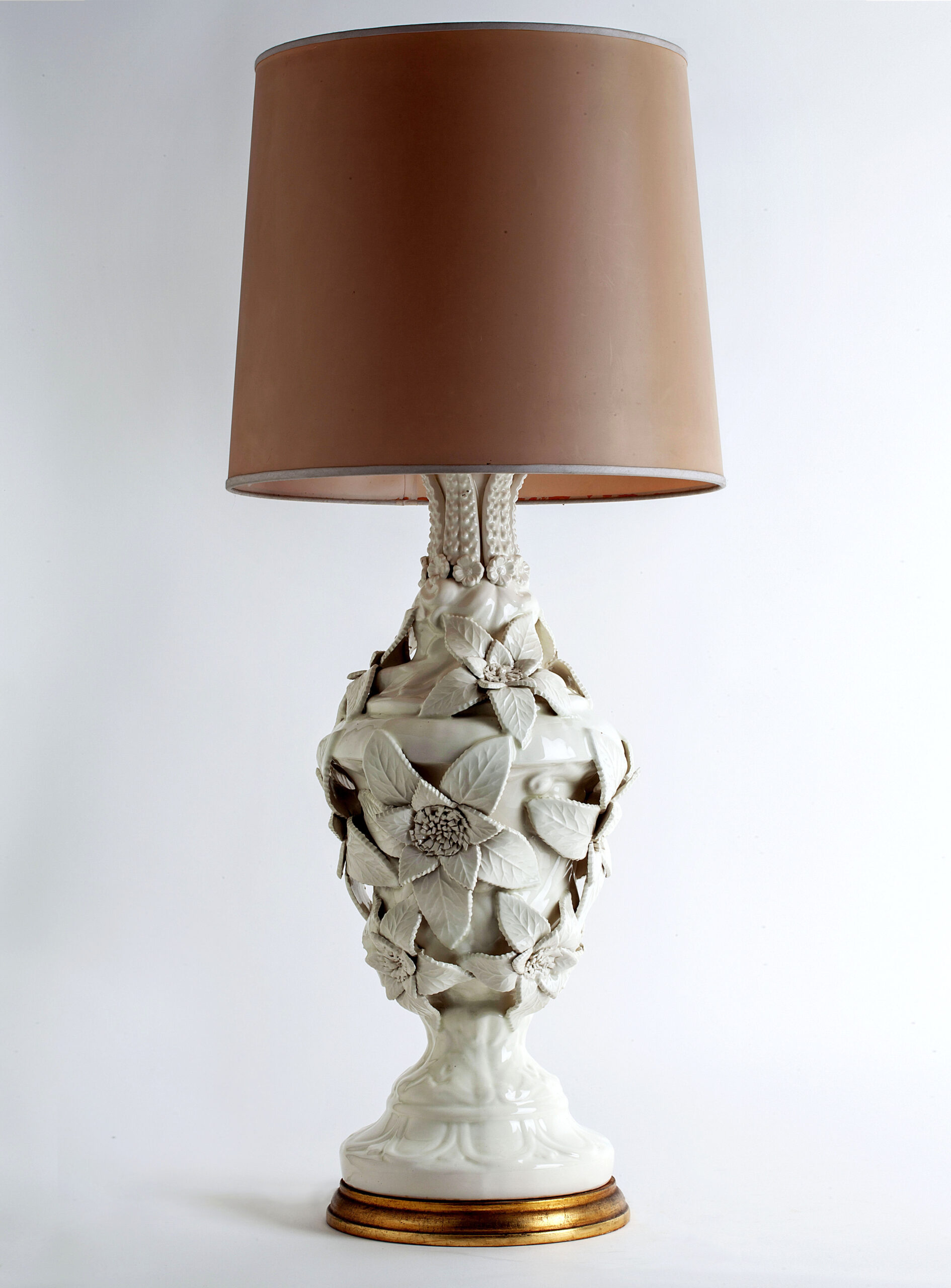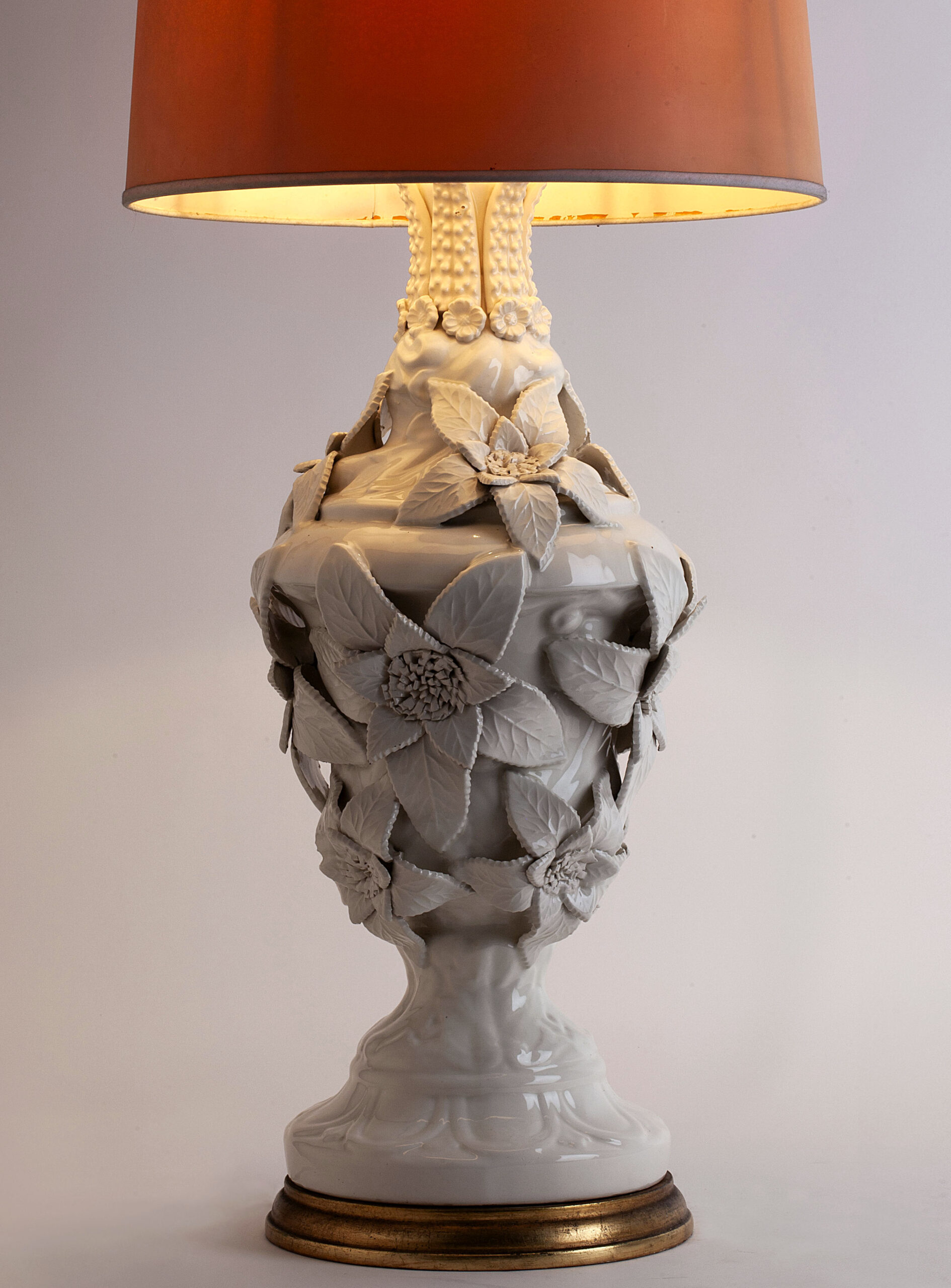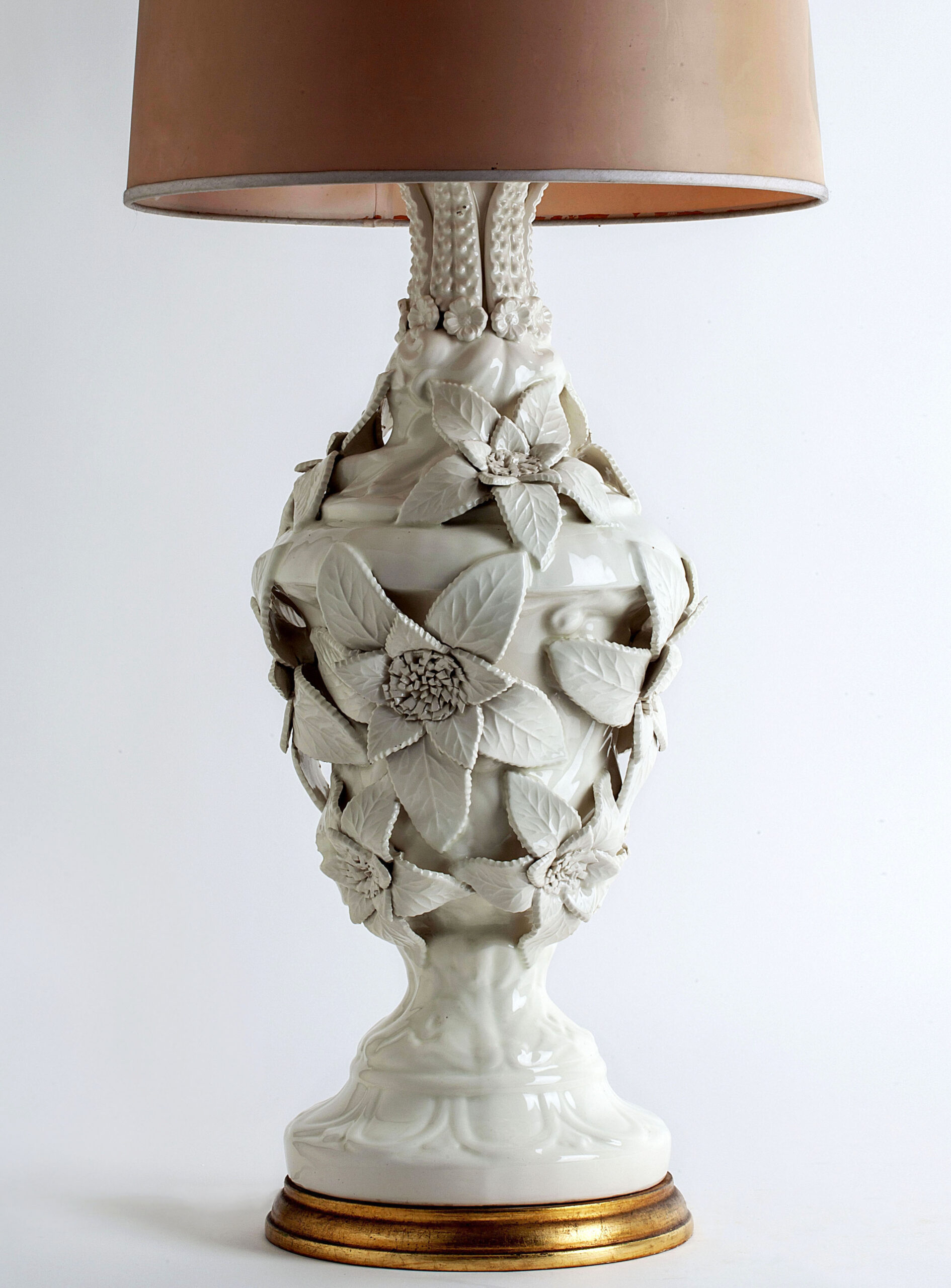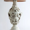 White glazed ceramic in the shape of a vase covered with large flowers.